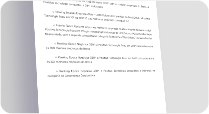 34 8. Reconhecimento Principais prêmios e reconhecimentos da Positivo Tecnologia em 2018: o Pelo terceiro ano consecutivo, recebeu homenagem do Grupo Padrão com o Prêmio Empresa Legal, destinado às empresas mais propensas ao diálogo, à mediação e à solução de conflitos, no evento A Era do Diálogo o Ranking “As Melhores da IstoÉ Dinheiro 2018“ com as maiores empresas do Brasil. A Positivo Tecnologia conquistou a 294ª colocação o Ranking Estadão Empresas Mais – 1.500 Maiores Companhias do Brasil 2018 – a Positivo Tecnologia ficou em 10º no TOP 10 das melhores empresas da região Sul o Prêmio Época Reclame Aqui – As melhores empresas no atendimento ao consumidor. Positivo Tecnologia ficou em 2º lugar no ranking Fabricantes de Eletrônicos. A Quantum também foi premiada, com a segunda colocação na categoria Fabricantes/Eletrônicos/Telefonia Celular o Ranking Época Negócios 360º, a Positivo Tecnologia ficou em 288º colocação entre as 500 maiores empresas do Brasil o Ranking Época Negócios 360º, a Positivo Tecnologia ficou em 245º colocação entre as 337 melhores empresas do Brasil o Ranking Época Negócios 360º, a Positivo Tecnologia conquistou a liderança na categoria de Governança Corporativa