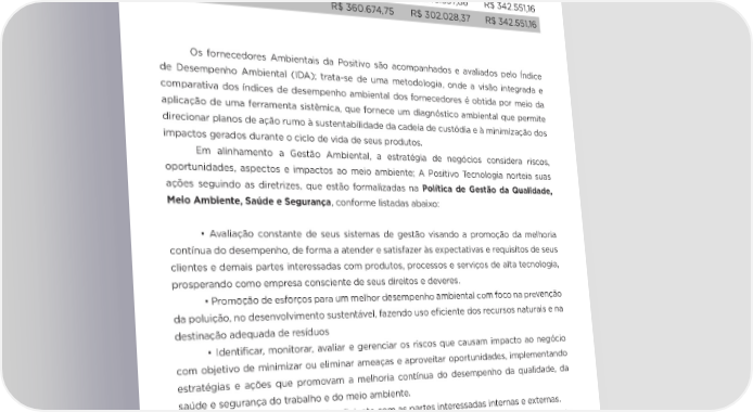 24 A Positivo possui gestão sobre investimentos e gastos na área ambiental, os principais investimentos com foco ambiental realizados foram distribuídos conforme apresenta o quadro a seguir: 2016 2017 2018 Disposição e mitigação de Resíduos R$ 111.371,51 R$ 55.430,51 R$70.552.78 Prevenção e Gestão ambiental R$ 249.303,24 R$ 246.597,86 R$ 342.551,16 Total R$ 360.674,75 R$ 302.028,37 R$ 342.551,16 Os fornecedores Ambientais da Positivo são acompanhados e avaliados pelo Índice de Desempenho Ambiental (IDA); trata-se de uma metodologia, onde a visão integrada e comparativa dos índices de desempenho ambiental dos fornecedores é obtida por meio da aplicação de uma ferramenta sistêmica, que fornece um diagnóstico ambiental que permite direcionar planos de ação rumo à sustentabilidade da cadeia de custódia e à minimização dos impactos gerados durante o ciclo de vida de seus produtos. Em alinhamento a Gestão Ambiental, a estratégia de negócios considera riscos, oportunidades, aspectos e impactos ao meio ambiente; A Positivo Tecnologia norteia suas ações seguindo as diretrizes, que estão formalizadas na Política de Gestão da Qualidade, Meio Ambiente, Saúde e Segurança, conforme listadas abaixo: • Avaliação constante de seus sistemas de gestão visando a promoção da melhoria contínua do desempenho, de forma a atender e satisfazer às expectativas e requisitos de seus clientes e demais partes interessadas com produtos, processos e serviços de alta tecnologia, prosperando como empresa consciente de seus direitos e deveres. • Promoção de esforços para um melhor desempenho ambiental com foco na prevenção da poluição, no desenvolvimento sustentável, fazendo uso eficiente dos recursos naturais e na destinação adequada de resíduos • Identificar, monitorar, avaliar e gerenciar os riscos que causam impacto ao negócio com objetivo de minimizar ou eliminar ameaças e aproveitar oportunidades, implementando estratégias e ações que promovam a melhoria contínua do desempenho da qualidade, da saúde e segurança do trabalho e do meio ambiente. • Estabelecer comunicação eficiente com as partes interessadas internas e externas. • Aprimorar continuamente o sistema de gestão integrado apoiando o direcionamento estratégico e o propósito da empresa;