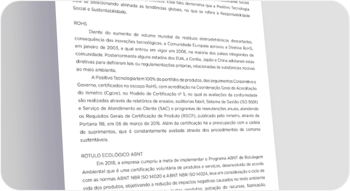 28 • Embalagens desenvolvidas com materiais reciclados e/ou biodegradáveis; • Garantia e disponibilidade de peças de reposição; • Ciclo de vida de produtos sustentável; • Logística reversa; e • Gestão Ambiental. Em 2018, a norma de referência para avaliação do EPEAT, a IEEE 1680.1, passou por revisão da versão publicada no ano de 2009, incluindo requisitos de Responsabilidade Social e Sustentabilidade na cadeia de suprimentos. Esse fato demonstra que a Positivo Tecnologia está se posicionando alinhada as tendências globais, no que se refere à Responsabilidade Social e Sustentabilidade. ROHS Diante do aumento de volume mundial de resíduos eletroeletrônicos descartados, consequência das inovações tecnológicas, a Comunidade Europeia aprovou a Diretiva RoHS, em janeiro de 2003, a qual entrou em vigor em 2006, na maioria dos países integrantes da comunidade. Posteriormente alguns estados dos EUA, a Coréia, Japão e China adotaram estas diretivas para definirem leis ou regulamentações próprias, relacionadas às substancias nocivas ao meio ambiente. A Positivo Tecnologia tem 100% do portfólio de produtos, dos seguimentos Corporativo e Governo, certificados no escopo RoHS, com acreditação na Coordenação Geral de Acreditação do Inmetro (Cgcre), no Modelo de Certificação nº 5, no qual as avaliações da conformidade são realizadas através de relatórios de ensaios, auditorias fabril, Sistema de Gestão (ISO 9001) e Serviço de Atendimento ao Cliente (SAC) e programas de manutenções anuais, atendendo os Requisitos Gerais de Certificação de Produto (RGCP), publicado pelo Inmetro, através da Portaria 118, em 06 de março de 2015. Além da certificação há a preocupação com a cadeia de suprimentos, que é constantemente avaliada através dos procedimentos de compras sustentáveis. RÓTULO ECOLÓGICO ABNT Em 2018, a empresa cumpriu a meta de implementar o Programa ABNT de Rotulagem Ambiental que é uma certificação voluntária de produtos e serviços, desenvolvido de acordo com as normas ABNT NBR ISO 14020 e ABNT NBR ISO 14024, leva em consideração o ciclo de vida dos produtos, objetivando a redução de impactos negativos causados no meio ambiente em todas as etapas do ciclo de vida destes produtos: extração de recursos, fabricação, distribuição, utilização e descarte. A ABNT é único membro pleno do Global Ecolabelling Network (GEN) na América do Sul. Somente produtos e serviços ecologicamente corretos, comprovadamente com menor impacto ambiental, podem ter um rótulo ecológico de membro GEN.