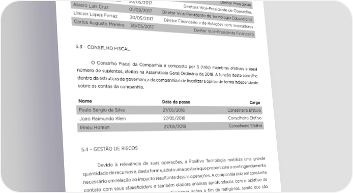 5.2 - PRESIDÊNCIA EXECUTIVA 18 A Diretoria da companhia é atualmente composta por 5 membros, sendo eleita pelo Conselho de Administração, com prazo de mandato de dois anos. A seguir, está apresentada a composição da Presidência Executiva da Positivo Tecnologia: Nome Data da posse Cargo Hélio Bruck Rotenberg 30/05/2017 Diretor Presidente Marielva Andrade Dias 30/05/2017 Diretora Vice-Presidente de Operações Alvaro Luis Cruz 01/08/2017 Diretor Vice-Presidente de Tecnologia Educacional Lincon Lopes Ferraz 30/05/2017 Diretor Financeiro e de Relações com Investidores Carlos Augusto Moreira 30/05/2017 Diretor Vice-Presidente Financeiro 5.3 – CONSELHO FISCAL O Conselho Fiscal da Companhia é composto por 3 (três) membros efetivos e igual número de suplentes, eleitos na Assembleia Geral Ordinária de 2018. A função deste conselho dentro da estrutura de governança da companhia é de fiscalizar e opinar de forma independente sobre as contas da companhia. Nome Data da posse Cargo Paulo Sergio da Silva 27/05/2018 Conselheiro Efetivo Joao Raimundo Klein 27/05/2018 Conselheiro Efetivo Irineu Homan 27/05/2018 Conselheiro Efetivo 5.4 – GESTÃO DE RISCOS Devido à relevância de suas operações, a Positivo Tecnologia mobiliza uma grande quantidade de recursos e, desta forma, adota uma postura que proporciona o contingenciamento necessário em relação ao impacto resultante dessas operações. A companhia está em constante contato com seus stakeholders e também elabora análises aprofundadas com o objetivo de identificar e quantificar os riscos para direcionar ações a fim de mitigá-los, sendo que são adotadas políticas e práticas para os temas mais relevantes. Uma discussão completa dos fatores de riscos que a companhia está sujeita está publicada em seu site de Relações com Investidores, e um detalhamento das políticas e práticas de gestão de riscos está apresentado pelos administradores da companhia em seu Formulário de Referência.