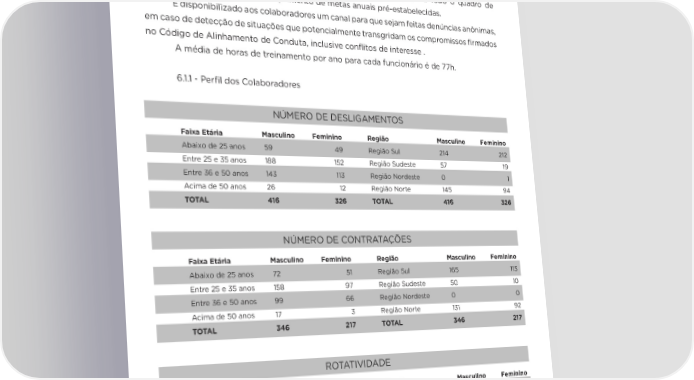 20 da empresa e a qualidade de vida do indivíduo. Ao final de 2018, 98,1% dos colaboradores da companhia estavam abrangidos por acordos de negociação coletiva. Os colaboradores em regime CLT têm a opção de aderir aos convênios de assistência médica e odontológica, bolsas para cursos de idiomas e pós graduação, auxílio creche, subsídio em mensalidades escolares e podem adquirir produtos da empresa em condições especiais . A empresa também oferece um programa de outorga e concessão de compra de ações (stock options) para executivos e outros funcionários relevantes, além de participação nos lucros para todo o quadro de colaboradores, mediante ao cumprimento de metas anuais pré-estabelecidas. É disponibilizado aos colaboradores um canal para que sejam feitas denúncias anônimas, em caso de detecção de situações que potencialmente transgridam os compromissos firmados no Código de Alinhamento de Conduta, inclusive conflitos de interesse . A média de horas de treinamento por ano para cada funcionário é de 77h. 6.1.1 - Perfil dos Colaboradores NÚMERO DE DESLIGAMENTOS Faixa Etária Masculino Feminino Região Masculino Feminino Abaixo de 25 anos 59 49 Região Sul 214 212 Entre 25 e 35 anos 188 152 Região Sudeste 57 19 Entre 36 e 50 anos 143 113 Região Nordeste 0 1 Acima de 50 anos 26 12 Região Norte 145 94 TOTAL 416 326 TOTAL 416 326 NÚMERO DE CONTRATAÇÕES Faixa Etária Masculino Feminino Região Masculino Feminino Abaixo de 25 anos 72 51 Região Sul 165 115 Entre 25 e 35 anos 158 97 Região Sudeste 50 10 Entre 36 e 50 anos 99 66 Região Nordeste 0 0 Acima de 50 anos 17 3 Região Norte 131 92 TOTAL 346 217 TOTAL 346 217 ROTATIVIDADE Faixa Etária Masculino Feminino Região Masculino Feminino Abaixo de 25 anos 4,8% 3,7% Região Sul 9,7% 8,4% Entre 25 e 35 anos 9,1% 7,1% Região Sudeste 2,9% 0,7% Entre 36 e 50 anos 6,2% 4,8% Região Nordeste 0,0% 0,0% Acima de 50 anos 0,3% 0,2% Região Norte 7,7% 6,7% TOTAL 20,4% 217 TOTAL 20,4% 15,9%