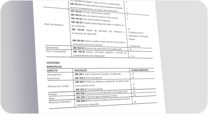 41 CONTEÚDOS GERAIS ASPECTO DESCRIÇÃO PÁGINA / RESPOSTA GRI 102-49 Alterações signi昀椀cativas de escopo e limites Não Houve de aspectos materiais em relação a relatórios anteriores GRI 102-40 Lista de grupos de stakeholders engajados 3 pela organização Engajamento de GRI 102-42 Base usada para a identi昀椀cação e seleção de 3 Stakeholders stakeholders para engajamento 3 GRI 102-43 Abordagem para envolver os stakeholders GRI 102-44 Principais tópicos e preocupações levantadas 3 durante o engajamento, por grupo de stakeholders 3 GRI 102-50 Período coberto pelo relatório 3 GRI 102-51 Data do relatório anterior mais recente 3 GRI 102-52 Ciclo de emissão de relatórios GRI 102-53 Contato para perguntas sobre o relatório ou Per昀椀l do Relatório seu conteúdo 42 GRI 102-56 Opção da aplicação das diretrizes e O relatório não foi localização da tabela GRI submetido à veri昀椀cação externa GRI 102-56 Política e prática atual relativa à busca para a veri昀椀cação externa do relatório G4 Essencial Governança GRI 102-18 Estrutura de governança da organização 16 Ética e Integridade GRI 102-16 Valores, princípios, padrões e normas de comportamento da organização 7 a 9 CONTEÚDO ESPECÍFICOS ASPECTO DESCRIÇÃO PÁGINA/RESPOSTA Desempenho GRI 201-1 Valor Econômico Gerado e Distribuído 23 Econômico GRI 103-2 Forma de gestão 23 GRI 204-1 Políticas, práticas e proporção de gastos com Práticas de Compra fornecedores locais 23 GRI 103-2 Forma de gestão 23 Energia GRI 302-1 Consumo de energia dentro da organização 23 Água GRI 303-1 Total de água retirada por fonte 30 E昀氀uentes e Resíduos GRI 306-2 Peso total de resíduos, discriminado por tipo e método de disposição 28