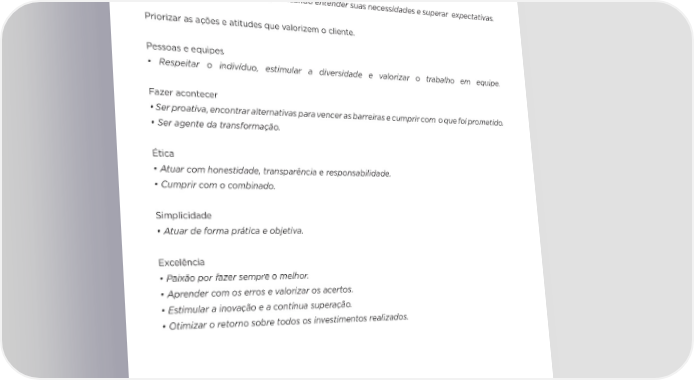 2.2 – PROPÓSITO E PRINCÍPIOS 7 Missão Tornar a vida das pessoas melhor e mais inteligente com tecnologia. Princípios Foco no cliente • Existir em função do cliente. • Colocar-se no lugar do cliente, buscando entender suas necessidades e superar expectativas. Priorizar as ações e atitudes que valorizem o cliente. Pessoas e equipes • Respeitar o indivíduo, estimular a diversidade e valorizar o trabalho em equipe. Fazer acontecer • Ser proativa, encontrar alternativas para vencer as barreiras e cumprir com o que foi prometido. • Ser agente da transformação. Ética • Atuar com honestidade, transparência e responsabilidade. • Cumprir com o combinado. Simplicidade • Atuar de forma prática e objetiva. Excelência • Paixão por fazer sempre o melhor. • Aprender com os erros e valorizar os acertos. • Estimular a inovação e a contínua superação. • Otimizar o retorno sobre todos os investimentos realizados.
