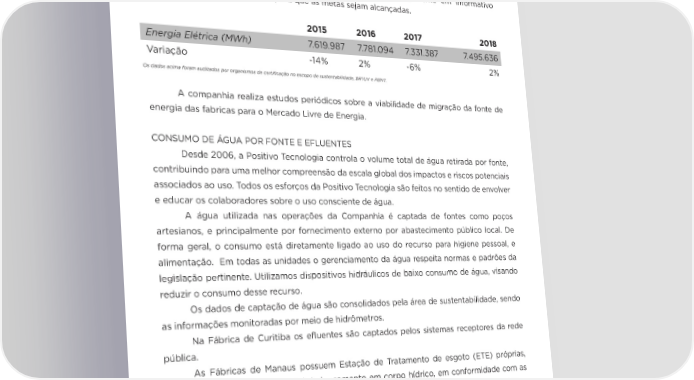 30 A Positivo Tecnologia gerencia o uso de energia em toda a sua cadeia de valor, para o monitoramento usamos a medição direta por meio das contas de eletricidade disponibilizadas mensalmente pelas empresas de Distribuição de Energia Elétrica. Em 2018, inciaran-se estudos relacionados a ISO 50001 (Sistema de Gestão de Energia) com o objetivo de estabelecimento de processos necessários para melhorar o desempenho energético, incluindo a eficiência energética, uso e consumo. Os indicadores são divulgados aos colaboradores periodicamente em informativo interno mensal, como incentivo para que as metas sejam alcançadas. 2015 2016 2017 2018 Energia Elétrica (MWh) 7.619.987 7.781.094 7.331.387 7.495.636 Variação -14% 2% -6% 2% Os dados acima foram auditados por organismos de certi昀椀cação no escopo de sustentabilidade, BRTUV e ABNT. A companhia realiza estudos periódicos sobre a viabilidade de migração da fonte de energia das fabricas para o Mercado Livre de Energia. CONSUMO DE ÁGUA POR FONTE E EFLUENTES Desde 2006, a Positivo Tecnologia controla o volume total de água retirada por fonte, contribuindo para uma melhor compreensão da escala global dos impactos e riscos potenciais associados ao uso. Todos os esforços da Positivo Tecnologia são feitos no sentido de envolver e educar os colaboradores sobre o uso consciente de água. A água utilizada nas operações da Companhia é captada de fontes como poços artesianos, e principalmente por fornecimento externo por abastecimento público local. De forma geral, o consumo está diretamente ligado ao uso do recurso para higiene pessoal, e alimentação. Em todas as unidades o gerenciamento da água respeita normas e padrões da legislação pertinente. Utilizamos dispositivos hidráulicos de baixo consumo de água, visando reduzir o consumo desse recurso. Os dados de captação de água são consolidados pela área de sustentabilidade, sendo as informações monitoradas por meio de hidrômetros. Na Fábrica de Curitiba os efluentes são captados pelos sistemas receptores da rede pública. As Fábricas de Manaus possuem Estação de Tratamento de esgoto (ETE) próprias, com monitoramento laboratorial de lançamento em corpo hídrico, em conformidade com as condicionantes da licença ambiental e de acordo com a legislação ambiental aplicável. GRI Em 2018, foram captados 31.653 m3 de água de fontes para uso.