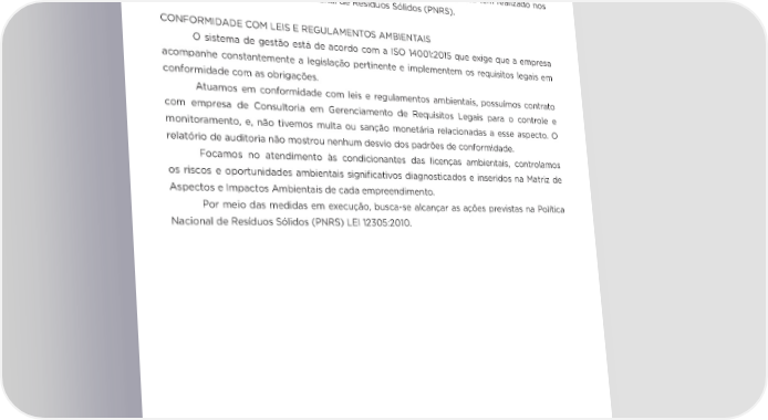 33 A Positivo Tecnologia não é geradora direta de efluentes de grandes impactos ambientais Em 2017 e 2018 não foram registradas vazamentos ou ocorrências com produtos que tenham causado impactos. As atividades desenvolvidas pela Positivo Tecnologia não geram resíduos perigosos. As peças e os equipamentos eletroeletrônicos gerados e não utilizados têm sido classificados como resíduos não perigosos, de acordo com o entendimento da Associação Brasileira da Indústria Elétrica e Eletrônica (Abinee) e por negociações que a empresa tem realizado nos estados, no âmbito da Política Nacional de Resíduos Sólidos (PNRS). CONFORMIDADE COM LEIS E REGULAMENTOS AMBIENTAIS O sistema de gestão está de acordo com a ISO 14001:2015 que exige que a empresa acompanhe constantemente a legislação pertinente e implementem os requisitos legais em conformidade com as obrigações. Atuamos em conformidade com leis e regulamentos ambientais, possuímos contrato com empresa de Consultoria em Gerenciamento de Requisitos Legais para o controle e monitoramento, e, não tivemos multa ou sanção monetária relacionadas a esse aspecto. O relatório de auditoria não mostrou nenhum desvio dos padrões de conformidade. Focamos no atendimento às condicionantes das licenças ambientais, controlamos os riscos e oportunidades ambientais significativos diagnosticados e inseridos na Matriz de Aspectos e Impactos Ambientais de cada empreendimento. Por meio das medidas em execução, busca-se alcançar as ações previstas na Política Nacional de Resíduos Sólidos (PNRS) LEI 12305:2010.