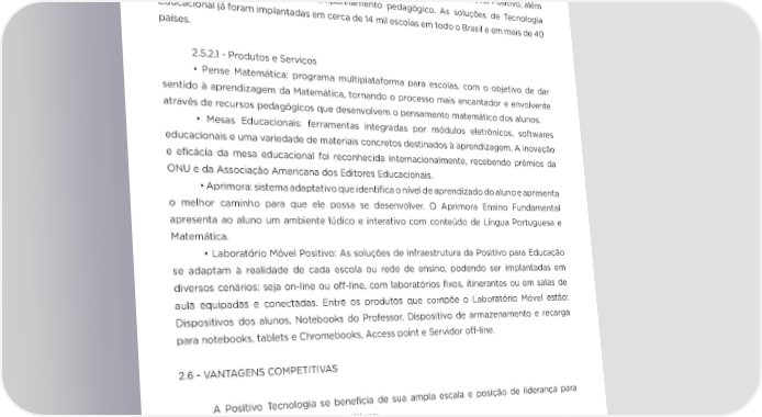 2.5.2 - Tecnologia Educacional 13 A Positivo Tecnologia Educacional representa a sinergia de atuação de duas grandes competências do Grupo Positivo: a Educação e a Tecnologia. Oferece soluções que enriquecem o processo de ensino-aprendizagem e transformam a sala de aula em um ambiente estimulante e desafiador para os alunos, além de tornar a tecnologia uma grande aliada no desenvolvimento docente, ampliando e aprimorando as competências dos professores. Oferece tecnologias como o Pense Matemática, Mesas Educacionais, Plataforma de Ensino Adaptativo Aprimora, Educacional Projetos, Conecta, Laboratório Móvel Positivo, além dos programas de formação e acompanhamento pedagógico. As soluções de Tecnologia Educacional já foram implantadas em cerca de 14 mil escolas em todo o Brasil e em mais de 40 países. 2.5.2.1 - Produtos e Serviços • Pense Matemática: programa multiplataforma para escolas, com o objetivo de dar sentido à aprendizagem da Matemática, tornando o processo mais encantador e envolvente através de recursos pedagógicos que desenvolvem o pensamento matemático dos alunos. • Mesas Educacionais: ferramentas integradas por módulos eletrônicos, softwares educacionais e uma variedade de materiais concretos destinados à aprendizagem. A inovação e eficácia da mesa educacional foi reconhecida internacionalmente, recebendo prêmios da ONU e da Associação Americana dos Editores Educacionais. • Aprimora: sistema adaptativo que identifica o nível de aprendizado do aluno e apresenta o melhor caminho para que ele possa se desenvolver. O Aprimora Ensino Fundamental apresenta ao aluno um ambiente lúdico e interativo com conteúdo de Língua Portuguesa e Matemática. • Laboratório Móvel Positivo: As soluções de infraestrutura da Positivo para Educação se adaptam à realidade de cada escola ou rede de ensino, podendo ser implantadas em diversos cenários: seja on-line ou off-line, com laboratórios fixos, itinerantes ou em salas de aula equipadas e conectadas. Entre os produtos que compõe o Laboratório Móvel estão: Dispositivos dos alunos, Notebooks do Professor, Dispositivo de armazenamento e recarga para notebooks, tablets e Chromebooks, Access point e Servidor off-line. 2.6 - VANTAGENS COMPETITIVAS A Positivo Tecnologia se beneficia de sua ampla escala e posição de liderança para potencializar suas vantagens competitivas: • Larga escala regional: por ser um dos players mais relevantes do mercado brasileiro, a Positivo Tecnologia possui grande vantagem de escala nacional em relação a seus competidores. Essa vantagem de escala permite maiores investimentos na marca e em ações de trade marketing no Brasil.
