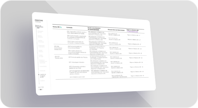 Relatório de Norma GRI Conteúdo Sessão neste Relatório Situação Geral de Materialidade Página no Relatório GRI Sustentabilidade de Sustentabilidade Ir para Relatório GRI 2021 205-1 Operações avaliadas quanto a Não destacado no Relatório de Item material com Mensagem riscos relacionados à corrupção Sustentabilidade 2021. Informação reporte no relatório GRI Página no Relatório GRI - 27 do CEO disponível no Relatório GRI 205-2 Comunicação e capacitação Não destacado no Relatório de Item material com Sobre o em políticas e procedimentos de Sustentabilidade 2021. Informação reporte no relatório GRI Página no Relatório GRI - 27 Relatório combate à corrupção disponível no Relatório GRI 1 Positivo 205-3 Casos con昀椀rmados de Não destacado no Relatório de Item material com Tecnologia corrupção e medidas tomadas Sustentabilidade 2021. Informação reporte no relatório GRI Página no Relatório GRI - 27 disponível no Relatório GRI 2 Governança GRI 206: 206 Forma de gestão da 2.3 Gerenciamento de Riscos e Item material com Corporativa Concorrência Concorrência Desleal Fiscalização / 2.4 Programa reporte no relatório GRI Página no Relatório GRI - 28 Desleal 2016 de Integridade 3 Capital 206-1 Ações judiciais por Não destacado no Relatório de Item material com Humano concorrência desleal, práticas de Sustentabilidade 2021. Informação reporte no relatório GRI Página no Relatório GRI - 28 truste e monopólio disponível no Relatório GRI 4 Cadeia 2.3 Gerenciamento de Riscos e Item material com de Valor GRI 207: 207 Forma de gestão dos Tributos Fiscalização / 5.1 Relacionamento Página no Relatório GRI - 28 Tributos 2019 com o Poder Público reporte no relatório GRI 5 Governo e Não destacado no Relatório de sociedade civil 207-1 Abordagem tributária Sustentabilidade 2021. Informação Item material com Página no Relatório GRI - 28 organizada disponível no Relatório GRI reporte no relatório GRI 6 Comunidades 207-2 Governança, controle e Não destacado no Relatório de Item material com gestão de risco 昀椀scal Sustentabilidade 2021. Informação reporte no relatório GRI Página no Relatório GRI - 28 disponível no Relatório GRI 7 Ambiental 207-3 Engajamento de stakeholders Não destacado no Relatório de e gestão de suas preocupações Sustentabilidade 2021. Informação Item material com Página no Relatório GRI - 28 Sumário de quanto a tributos disponível no Relatório GRI reporte no relatório GRI Conteúdo Item considerado não da GRI 207-4 Relatório país-a-país - Página no Relatório GRI - 29 material para o reporte de 2021 Créditos 64