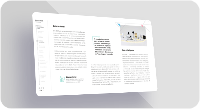 Relatório de Educacional Sustentabilidade 2021 Em 2021, a área de tecnologias para educação, que Mensagem já acumulava 27 anos de experiência, exportando do CEO soluções para mais de 40 países e com parcerias Sobre o sólidas com a LEGO® Education e a Fundação Edu- A área de tecnologias Relatório cacional micro:bit, passou por uma transformação para educação passou 1 Positivo no modelo de negócio e posicionamento, sendo por uma transformação Tecnologia rebatizada com o nome Educacional – Ecossiste- no modelo de negócio e 2 Governança ma de Tecnologia e Inovação. posicionamento, sendo Corporativa rebatizada com o nome Casa Inteligente 3 Capital O Educacional tem como propósito tornar a jor- Educacional – Ecossistema Humano nada de ensino e aprendizagem verdadeiramen- de Tecnologia e Inovação. Em 2019, a Companhia lançou a marca Positivo 4 Cadeia te signi昀椀cativa para alunos da educação básica. O Casa Inteligente, com dispositivos especialmente de Valor novo modelo de atuação se baseou na constru- desenvolvidos para o consumidor brasileiro, bus- 5 Governo e ção de um ecossistema aberto, que apoia escolas, cando tornar as casas brasileiras mais inteligentes, sociedade civil redes, municípios e estados em seus projetos de seguras e conectadas. A marca Positivo Casa Inte- organizada educação de forma 360º. Para materializar essa As Suítes Pedagógicas são uma solução de apren- ligente oferece kits completamente sem 昀椀o (insta- 6 Comunidades proposta, a área desenvolveu uma solução educa- dizagem inovadora, criada para apoiar as institui- lador não é necessário), compostos por câmeras cional única, as Suítes Pedagógicas. ções de ensino no desenvolvimento de novas práti- wi-昀椀, tomada de alimentação, lâmpadas inteligen- 7 Ambiental cas de uso da tecnologia. Em apenas um ambiente tes, controle universal, alarme e sensores de segu- Sumário de digital é possível criar um ecossistema personali- rança. Com a Positivo Casa Inteligente, é possível Conteúdo zado com acesso a todos os recursos que a insti- monitorar a casa/apartamento, controlar a ilumi- da GRI Educacional tuição possui e também às melhores aplicações de nação dos ambientes e a ligação de diversos apa- apoia escolas, redes, municípios Créditos e estados em seus projetos de Língua Portuguesa, Matemática, STEAM (Science, relhos eletrodomésticos à distância, possibilitando educação de forma 360º Technology, Engineering, Arts e Mathematics), So- o monitoramento do consumo e o uso mais e昀椀- cioemocional, Assessment e Gestão. ciente da energia. 14