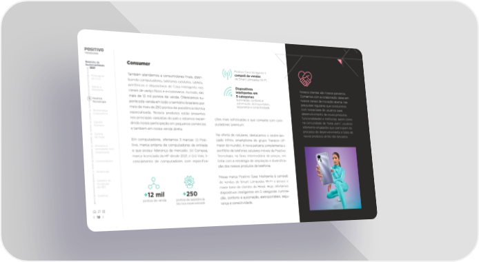 Relatório de Consumer Positivo Casa Inteligente é Sustentabilidade 2021 campeã de vendas Também atendemos a consumidores 昀椀nais, distri- de Smart Lâmpadas Wi-Fi Mensagem buindo computadores, telefones celulares, tablets, do CEO periféricos e dispositivos de Casa Inteligente nos Dispositivos Nossos clientes são nossos parceiros. Sobre o canais de varejo físico e e-commerce. Ao todo, são inteligentes em Contamos com a colaboração deles em Relatório 5 categorias: mais de 12 mil pontos de venda. Oferecemos su- iluminação, conforto e nossos canais de inovação aberta, nas 1 Positivo porte pós-venda em todo o território brasileiro por automação, eletroportáteis, pesquisas regulares que conduzimos Tecnologia segurança e conectividade com nossa base de usuários para meio de mais de 250 pontos de assistência técnica desenvolvimento de novos produtos, 2 Governança especializada. Nossos produtos estão presentes Corporativa funcionalidades e melhorias, assim como nos principais varejistas do país e estamos expan- ções mais so昀椀sticadas e que compete com com- na comunidade de “beta users”, usuários 3 Capital dindo nossa participação em pequenos comércios putadores ‘premium’. altamente engajados que participam do Humano e tambem em nossa venda direta. processo de desenvolvimento e teste de 4 Cadeia Na oferta de celulares, destacamos o recém-lan- novos produtos ainda não lançados. de Valor Em computadores, ofertamos 3 marcas: (i) Posi- çado In昀椀nix, smartphone do grupo Transion (4ª 5 Governo e tivo, marca própria de computadores de entrada maior do mundo). A nova parceria complementa o sociedade civil e que possui liderança de mercado; (ii) Compaq, portfólio de telefones celulares móveis da Positivo organizada marca licenciada da HP desde 2021; e (iii) Vaio, li- Tecnologia, na faixa intermediária de preços, em 6 Comunidades cenciamento de computadores com especi昀椀ca- linha com a estratégia de ampliação e diversi昀椀ca- ção dos nossos produtos de telefonia. 7 Ambiental Sumário de Nossa marca Positivo Casa Inteligente é campeã Conteúdo de vendas de Smart Lâmpadas Wi-Fi e possui a da GRI maior base de clientes do Brasil. Hoje, ofertamos Créditos +12 mil +250 dispositivos inteligentes em 5 categorias: ilumina- pontos de venda pontos de assistência ção, conforto e automação, eletroportáteis, segu- técnica especializada rança e conectividade. 12