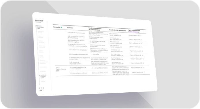 Relatório de Norma GRI Conteúdo Sessão neste Relatório Situação Geral de Materialidade Página no Relatório GRI Sustentabilidade de Sustentabilidade Ir para Relatório GRI 2021 2.6 Compromissos Públicos Item material com Mensagem 2-23 Políticas de compromissos e Certi昀椀cações / 5.1 Relacionamento reporte no relatório GRI Página no Relatório GRI - 12 do CEO com o Poder Público Sobre o 2-24 Incorporando as políticas 5.1 Relacionamento com o Item material com Página no Relatório GRI - 12 Relatório de compromissos Poder Público reporte no relatório GRI 2-25 Processos para remediar 2.3 Gerenciamento de Riscos Item material com Página no Relatório GRI - 13 1 Positivo impactos negativos e Fiscalização reporte no relatório GRI Tecnologia 2-26 Mecanismos para buscar 2.3 Gerenciamento de Riscos Item material com Página no Relatório GRI - 13 2 Governança orientação e expor preocupações e Fiscalização reporte no relatório GRI Corporativa 2.3 Gerenciamento de Riscos e Item material com 2-27 Cumprimento da legislação Fiscalização / 5.1 Relacionamento reporte no relatório GRI Página no Relatório GRI - 13 3 Capital com o Poder Público Humano Item material com 2-28 Participação em associações 5.2 Associações reporte no relatório GRI Página no Relatório GRI - 14 4 Cadeia de Valor 2-29 Abordagem para o engajamento 2.5 A Jornada ESG da Positivo / Item material com Página no Relatório GRI - 14 de stakeholders 4.3 Con昀椀ança e Colaboração reporte no relatório GRI 5 Governo e Não destacado no Relatório de sociedade civil 2-30 Acordos de Sustentabilidade 2021. Informação Item material com Página no Relatório GRI - 15 organizada Negociação Coletiva reporte no relatório GRI disponível no Relatório GRI 6 Comunidades GRI 3: 3-1 Processo para determinar Item material com reporte no Tópicos Materiais os tópicos materiais 2.5 A Jornada ESG da Positivo relatório GRI, porém realizado em Página no Relatório GRI - 15 2021 2022, após período deste reporte 7 Ambiental Item material com reporte no 3-2 Lista de tópicos materiais 2.5 A Jornada ESG da Positivo relatório GRI, porém realizado em Página no Relatório GRI - 17 Sumário de 2022, após período deste reporte Conteúdo da GRI Créditos 61