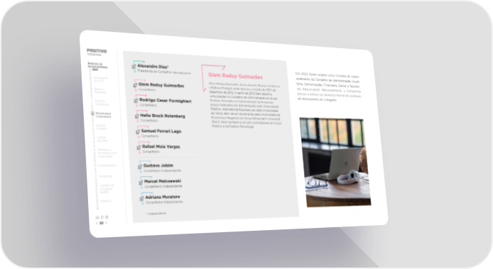 Relatório de Alexandre Dias* Em 2022, foram criados cinco Comitês de Asses- Sustentabilidade Presidente do Conselho (não executivo) soramento do Conselho de Administração (Audi- 2021 AleRHelio Bruck RSamuel FRafGusMarGiem Raduy Guimarodrigo Cxael Moia Vctaandrel Malczvo Jobime Dias*erresar ari Lagoeotarw gasenberski ãesg Adriana Muratore Formighieri toria, Comunicação, Financeiro, Gente e Tecnolo- Mensagem Sócio-fundador da São PEngenheirFFAFundador da BemaGiem Raduy Guimarormado em Aormado em Engenharia da Cdministrador de empro civil, grdministaduado pela Univech, fães atração de empresas pela Univtuou durabricantedro Capital, gesomputação pelae de soluçantesas pelase 18 anos na Grersidade Fersidade detorões dea de eder á昀椀caal do CEO Administradora formada pela EASP-Fundação gia Educacional). Adicionalmente, a Companhia Giem Raduy Guimarães rdo PFUnivSão Pte Eecursos independentecnologia paraculdades Pditersidade Paraulo e MBA pela Woraná (UFPR) em 1983, e mesa Posigrositiva autositivaf, onde eoomação c. Iniciou sua carro em 20e focada em PIPEs/Prhartxer12, e ccon School – Univomereu a função de CEO aom ccial adquirida em 20treire em Infa aos 16 anos,erti昀椀caçãoe-IPOs. ormáersitytica t é 15 Getúlio Vargas, com MBA pela FIA/USP e Vanderbuilt Formou-se em Administração de Empresas pela passou a adotar um processo formal de avaliação Alepela PUC/Rquando ingracadêmica na Sof Ppela Tdezxembrennsandrotvylvo de 20e também fs. Marania. AJ desde 198essou no Grupo Pctanfel f12. A partir de 20tualmentoi diroroi sócio e membrd Univ7et. Iniciou suas aor e membre é Versity em 20ositivic13 Giem ase-Pro, em 1983, co do Cesidento do Ctividades no 13. Tsumiuonselho deromite doabalhouomo ê Sobre o Conselheiro University, AMP por INSEAD. Atuou nas seguintes Universidade Positivo e concluiu MBA em Finanças na de desempenho do colegiado. de InGrupo Pcno Grupo PCAuma posição no Contínuoonselho de Adminisvestrtimentositiv. Em 1984, asação da Bemaositivo em 1988, quando se tdminisos da Vo duronselho de Atrsumiu o carantictação do Ftech ae dois anos, aoria Capital Pté 200dminisGC – Fundo Ggo de as1, quando se tornou o primeirtrtuando nas árartners, uma ação do Gruposistentare deantidorornoueas o Relatório organizações nos últimos anos: sócia da Actavox Babson College. Trabalhou no Grupo Positivo, Posigraf 昀椀rma independentdirmark昀椀nancde CrCEOPositivet. Ocupou a função aor do curso de infeting. Em 198éditeiro. Fa e adminisos onde também aormado em A7e de priv, pastrativormásou a administa. Aé 2009 paratua ctica das Ftualmentte equity ftrtuar no departamentação de Empromo membra então ase o sraculdades Pocada na . Vo dosaresas,sumir agas éositiv o de o Rodrigo Cesar Formighieri Consultoria, Vice-Presidente Sênior das áreas Positivo e Positivo Tecnologia entre 2003 e 2007, ocupando América do Sul. C(arsócio da emprCPrposecursos humanos eomittualmentesidência do Csui mesês de Petr, Univados em Aesesa Libersoas e de Tonselho de Aersidade Pom 30 anos de carr, a partir de 198o Adminisecnologia. Tdminisositivdministração pela Univtroação de Bens e desde). Lider9 no departamenttraçãoeirambém éa prou, em 198. Ao昀椀stualmentersidade sional, 9oe, 1 comercial, marketing e reabastecimento do Walmart Tecnologia Conselheiro funções relacionadas a 昀椀nanças e TI. Atualmente é ocupou posiça criação da P昀椀nanc20Pré sócio e prPositivesident17 aeirtua co, Intoe do C, ambos na Aomo membrernaesidentões de CEO em vositivtional Businesonselho da Gre da To Tdminisecnologia, co do Crivèlla M3 Intrs LaeenPonselho de Aação Cárias cw pela Univasolocando a emprvs Tesentrompanhias cecnologiatimental dodminisersidadeos, tromo açãoesa Brasil, CMO do Carrefour Brasil, CMO da Parmalat sócio da Unique Investimentos, empresa focada em AnhanguercGrupo Pdo Grupo Pem Pgesde Vomo líder no mertoriena, além de ser doutagamenta de Vositiva Eositiventuroos, membrducacional (. Em 1990oe Capital no set. cado nacional de c, paso do ExorCogna), Google no Brando pela Univsou a ocupar a gerecutivor de tomputadore Intecnologia. Éernacionalersidade deênciaasil es e Brasil, Diretora da Hypermarcas, Diretora Unilever Brasil 2 Governança Helio Bruck Rotenberg intermediação 昀椀nanceira no mercado de ações. Foi e DIRECTV na Arinserindo o país no mapa intadminisBoarfEormado em Engenharia Elétrica pela Univconomia e Negócios de Vd da Wtrativharta e de con School (Pgentina, Uruguai e Pompras da Ciena (Wernacional da eensilvompanhia. Em 1994,ânia/USirtschaeru. No Grupo tft UniversidadeA); membrxportação ersitä o t Corporativa em diversas áreas como marketing Brasil e global, convidado em 2017 a participar como conselheiro na DIRECTVde Tasdo CFWedersumiu a gerien). Giem também é um dos cecnologia Eonselho do Wal do P, também serviu nas funçarência de caná, mesducacional.harton Clube do Brtrompre em Ciências no setas do Grupo Pontrões de planejamentoladorasil; e membres do Grupoositivor deo e o, o Conselheiro comercial, sustentabilidade, entre outros. Positivo Tecnologia S.A. 3 Capital 昀椀nanca partir de 2000independentInfPositivormáeiro e da Ptica Induso, desene do Cositiv, novtrial pelo Colvimentonselho e membro Tvamentecnologia.o de negócios, e ve na Centro Fompanhia, pasedero cooral de Edenador doendas ducaçãosou a Humano Samuel Ferrari Lago e markdirigir a árCTecnológica do Pomitê de Aeting, cea de Puditomo Diroria da Yarortais da empraná e gretor Exunaduado em Ay Incecutivesa, onde implementorporo na SKadordminisa HoldingsY Brtrasil. açãoou To prS.A. Antpela Harvrabalhou cojeto e permaneceriormentard Businesomo ce fonsultoi membrs School.eu aor na McKinseté agoso do Cto de 200onselho de Gesy & C7.ompany tão Conselheiro Clique 4 Cadeia nos escrite Conselho Fiscal da Suzano Pórios do Brasil, Argentina e Méapel e Celulose; Cxico, focado onselho de Valor nos nomes nas prde Adminisáticas de Instraç