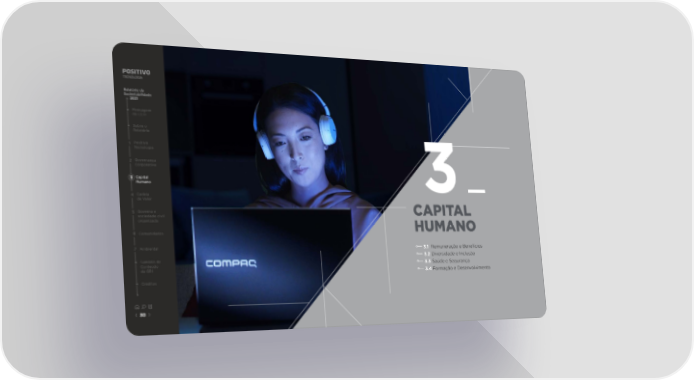 Relatório de Sustentabilidade 2021 Mensagem do CEO Sobre o Relatório 1 Positivo Tecnologia 2 Governança Corporativa 3 Capital Humano 3 4 Cadeia de Valor 5 Governo e CAPITAL sociedade civil organizada HUMANO 6 Comunidades 7 Ambiental 3.1 Remuneração e Benefícios 3.2 Diversidade e Inclusão Sumário de 3.3 Saúde e Segurança Conteúdo da GRI 3.4 Formação e Desenvolvimento Créditos 30