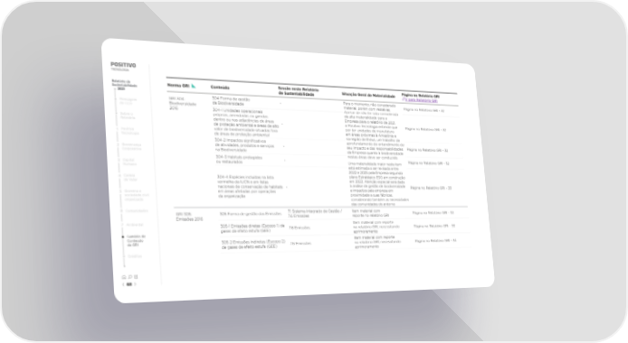 Relatório de Norma GRI Conteúdo Sessão neste Relatório Situação Geral de Materialidade Página no Relatório GRI Sustentabilidade de Sustentabilidade Ir para Relatório GRI 2021 GRI 304: 304 Forma de gestão - Para o momento, não considerado Página no Relatório GRI - 32 Mensagem Biodiversidade da Biodiversidade material, porém com ressalvas. do CEO 2016 304-1 Unidades operacionais Apesar de não ter sido considerada próprias, arrendadas ou geridas de alta materialidade para a Sobre o dentro ou nas adjacências de áreas Empresa para o relatório de 2021, Relatório de proteção ambiental e áreas de alto - a Positivo Tecnologia entende que Página no Relatório GRI - 32 valor de biodiversidade situadas fora por ter unidades de manufatura 1 Positivo de áreas de proteção ambiental em áreas próximas à Amazônia e Tecnologia na região de Ilhéus, um trabalho de 304-2 Impactos signi昀椀cativos aprofundamento do entendimento de 2 Governança de atividades, produtos e serviços - seu impacto e das responsabilidades Página no Relatório GRI - 32 Corporativa na Biodiversidade da Empresa quanto à biodiversidade 304-3 Habitats protegidos nestas áreas deve ser conduzido. 3 Capital ou restaurados - Uma materialidade maior neste item Página no Relatório GRI - 32 Humano está estimada a ser revisada entre 2022 e 2025 pela Empresa seguindo 4 Cadeia 304-4 Espécies incluídas na lista plano Estratégico ESG em construção de Valor vermelha da IUCN e em listas em 2022. Atenção especial será dada nacionais de conservação de habitats - à análise de gestão de biodiversidade Página no Relatório GRI - 33 5 Governo e em áreas afetadas por operações e impactos pela empresa em sociedade civil da organização proximidade a suas fábricas, organizada considerando também as necessidades das comunidades do entorno 6 Comunidades GRI 305: 305 Forma de gestão das Emissões 7.1 Sistema Integrado de Gestão / Item material com Página no Relatório GRI - 33 Emissões 2016 7.6 Emissôes reporte no relatório GRI 7 Ambiental 305-1 Emissões diretas (Escopo 1) de Item material com reporte gases de efeito estufa (GEE) 7.6 Emissôes no relatório GRI, necessitando Página no Relatório GRI - 33 Sumário de aprimoramento Conteúdo 305-2 Emissões indiretas (Escopo 2) Item material com reporte da GRI 7.6 Emissôes no relatório GRI, necessitando Página no Relatório GRI - 34 de gases de efeito estufa (GEE) aprimoramento Créditos 68