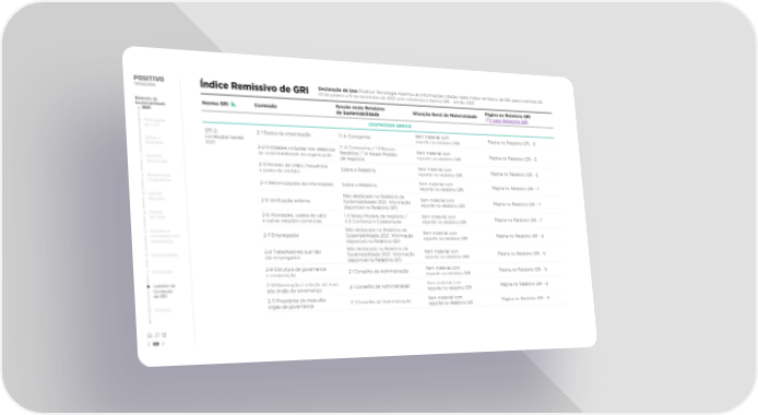 Índice Remissivo de GRI Declaração de Uso: Positivo Tecnologia reportou as informações citadas neste índice remissivo de GRI para o período de 01 de janeiro a 31 de dezembro de 2021 com referência à Norma GRI - versão 2021. Relatório de Norma GRI Conteúdo Sessão neste Relatório Situação Geral de Materialidade Página no Relatório GRI Sustentabilidade de Sustentabilidade Ir para Relatório GRI 2021 CONTEÚDOS GERAIS Mensagem do CEO GRI 2: 2-1 Dados da organização 1.1 A Companhia Item material com Página no Relatório GRI - 6 Conteúdos Gerais reporte no relatório GRI Sobre o 2021 1.1 A Companhia / 1.3 Nossos Relatório 2-2 Entidades incluídas nos relatórios Negócios / 1.4 Nosso Modelo Item material com Página no Relatório GRI - 6 de sustentabilidade da organização de negócios reporte no relatório GRI 1 Positivo Tecnologia 2-3 Período de relato, frequência Sobre o Relatório Item material com Página no Relatório GRI - 6 e ponto de contato reporte no relatório GRI 2 Governança Item material com Corporativa 2-4 Reformulações de informações Sobre o Relatório reporte no relatório GRI Página no Relatório GRI - 7 3 Capital Não destacado no Relatório de Item material com Humano 2-5 Veri昀椀cação externa Sustentabilidade 2021. Informação reporte no relatório GRI Página no Relatório GRI - 7 disponível no Relatório GRI 4 Cadeia 2-6 Atividades, cadeia de valor 1.4 Nosso Modelo de negócios / Item material com Página no Relatório GRI - 7 de Valor e outras relações comerciais 4.3 Con昀椀ança e Colaboração reporte no relatório GRI 5 Governo e Não destacado no Relatório de Item material com sociedade civil 2-7 Empregados Sustentabilidade 2021. Informação reporte no relatório GRI Página no Relatório GRI - 8 organizada disponível no Relatório GRI 2-8 Trabalhadores que não Não destacado no Relatório de Item material com 6 Comunidades são empregados Sustentabilidade 2021. Informação reporte no relatório GRI Página no Relatório GRI - 9 disponível no Relatório GRI 7 Ambiental 2-9 Estrutura de governança 2.1 Conselho de Administração Item material com Página no Relatório GRI - 9 e composição reporte no relatório GRI Sumário de 2-10 Nomeação e seleção do mais 2.1 Conselho de Administração Item material com Página no Relatório GRI - 9 Conteúdo alto órgão de governança reporte no relatório GRI da GRI 2-11 Presidente do mais alto 2.1 Conselho de Administração Item material com Página no Relatório GRI - 9 Créditos órgão de governança reporte no relatório GRI 59