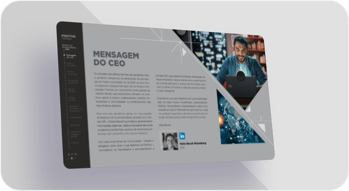 Relatório de Sustentabilidade 2021 MENSAGEM Mensagem do CEO Sobre o DO CEO Relatório 1 Positivo O contraste dos efeitos terríveis da pandemia, com jornada ESG que estamos trilhando, alicerçada em Tecnologia o aumento vertiginoso da penetração da tecnolo- nosso propósito, nossos valores e em nossa história 2 Governança gia em toda a sociedade, fez de 2021 um ano mui- de contribuição para o avanço da tecnologia aces- Corporativa to especial e inesquecível para nós na Positivo Tec- sível no Brasil, tornando a vida das pessoas melhor 3 Capital nologia. Tivemos um crescimento muito grande ao e mais inteligente. Humano mesmo tempo que procuramos oferecer um con- 4 Cadeia tínuo apoio a nossos colaboradores, clientes, for- Esperamos que este Relatório de Sustentabilidade de Valor necedores e comunidades no enfrentamento dos seja útil para nossos investidores, colaboradores, 5 Governo e mais diversos desa昀椀os. clientes, fornecedores, revendedores e para a so- sociedade civil ciedade em geral. Pretendemos aprimorá-lo a cada organizada Para esse ano, decidimos adotar um novo padrão nova edição. Sugestões e dúvidas a respeito do con- 6 Comunidades de Relatório de Sustentabilidade, alinhado aos crité- teúdo do documento serão sempre bem-vindas. rios GRI – Global Reporting Initiative, apresentando 7 Ambiental informações objetivas, claras e transparentes sobre Boa leitura! Sumário de os aspectos ambientais, sociais e de governança re- Conteúdo levantes da Companhia e de nossos negócios. da GRI Créditos Com essa nova forma de comunicação - simples e amigável, como tudo o que fazemos na Positivo -, Helio Bruck Rotenberg convidamos os interessados a acompanharem a CEO 3