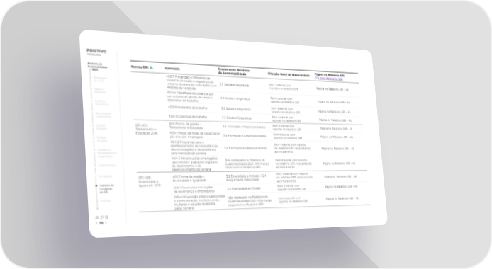 Relatório de Norma GRI Conteúdo Sessão neste Relatório Situação Geral de Materialidade Página no Relatório GRI Sustentabilidade de Sustentabilidade Ir para Relatório GRI 2021 403-7 Prevenção e mitigação de Mensagem impactos de saúde e segurança do 3.3 Saúde e Segurança Item material com Página no Relatório GRI - 44 do CEO trabalho diretamente vinculados com reporte no relatório GRI relações de negócios Sobre o 403-8 Trabalhadores cobertos por Item material com Relatório um sistema de gestão de saúde e 3.3 Saúde e Segurança Página no Relatório GRI - 45 segurança do trabalho reporte no relatório GRI 1 Positivo Item material com Tecnologia 403-9 Acidentes de trabalho 3.3 Saúde e Segurança reporte no relatório GRI Página no Relatório GRI - 45 2 Governança 403-10 Doenças de trabalho 3.3 Saúde e Segurança Item material com Página no Relatório GRI - 45 Corporativa reporte no relatório GRI GRI 404: 404 Forma de gestão – 3.4 Formação e Desenvolvimento Item material com Página no Relatório GRI - 45 3 Capital Treinamento e Educação reporte no relatório GRI Humano Treinamento e Educação 2016 404-1 Média de horas de capacitação 3.4 Formação e Desenvolvimento Item material com Página no Relatório GRI - 45 4 Cadeia por ano, por empregado reporte no relatório GRI de Valor 404-2 Programas para o Item material com reporte aperfeiçoamento de competências 3.4 Formação e Desenvolvimento no relatório GRI, necessitando Página no Relatório GRI - 45 5 Governo e dos empregados e de assistência aprimoramento sociedade civil para transição de carreira organizada 404-3 Percentual de empregados que recebem avaliações regulares Não destacado no Relatório de Item material com reporte 6 Comunidades de desempenho e de Sustentabilidade 2021. Informação no relatório GRI, necessitando Página no Relatório GRI - 46 desenvolvimento de carreira disponível no Relatório GRI aprimoramento 7 Ambiental GRI 405: 405 Forma de gestão – 3.2 Diversidade e Inclusão / 2.4 Item material com reporte Diversidade e Diversidade e Igualdade Programa de Integridade no relatório GRI, necessitando Página no Relatório GRI - 46 Sumário de Igualdade 2016 aprimoramento Conteúdo 405-1 Diversidade em órgãos 3.2 Diversidade e Inclusão Item material com Página no Relatório GRI - 46 da GRI de governança e empregados reporte no relatório GRI Créditos 405-2 Proporção entre o salário-base Não destacado no Relatório de e a remuneração recebidos pelas Sustentabilidade 2021. Informação Item material com Página no Relatório GRI - 46 mulheres e aqueles recebidos disponível no Relatório GRI reporte no relatório GRI pelos homens 72