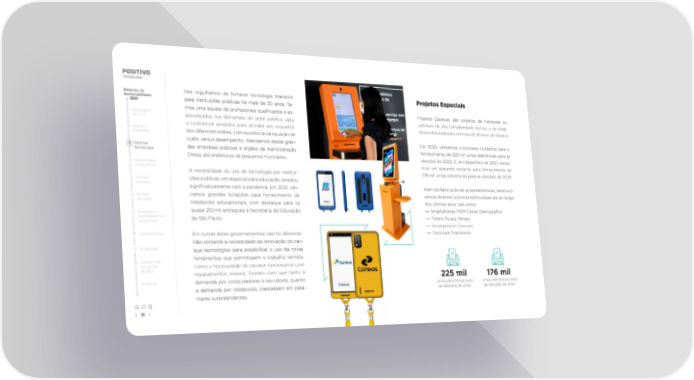 Relatório de Nos orgulhamos de fornecer tecnologia brasileira Projetos Especiais Sustentabilidade para instituições públicas há mais de 30 anos. Te- 2021 mos uma equipe de pro昀椀ssionais quali昀椀cados e es- Projetos Especais são projetos de hardware ou Mensagem pecializados nas demandas do setor público, apta software de alta complexidade técnica e de enge- do CEO a customizar produtos para atender aos requisitos nharia desenvolvidos em mais de 30 anos de história. Sobre o dos diferentes editais, com excelência na equação de Relatório custo versus desempenho. Atendemos desde gran- Em 2020, vencemos o processo licitatório para o 1 Positivo des empresas públicas e órgãos da Administração fornecimento de 225 mil urnas eletrônicas para as Tecnologia Direta, até prefeituras de pequenos municípios. eleições de 2022. E, em dezembro de 2021, vence- 2 Governança mos um segundo certame para fornecimento de Corporativa A necessidade do uso de tecnologia por institui- 176 mil urnas eletrônicas para as eleições de 2024. 3 Capital ções públicas, em especial para educação, ampliou Humano signi昀椀cativamente com a pandemia. Em 2021, ven- Além da fabricação de urnas eletrônicas, desenvol- 4 Cadeia cemos grandes licitações para fornecimento de vemos diversos outros projetos especiais ao longo de Valor notebooks educacionais, com destaque para os dos últimos anos, tais como: 5 Governo e quase 210 mil entregues à Secretaria de Educação — Smartphones MDM Censo Demográ昀椀co sociedade civil de São Paulo. — Totens Poupa Tempo organizada — Smartphones Correios 6 Comunidades Em outras áreas governamentais não foi diferente. — Terminais 昀椀nanceiros Não somente a necessidade de renovação do par- 7 Ambiental que tecnológico para possibilitar o uso de novas Sumário de ferramentas que permitissem o trabalho remoto, Conteúdo como a necessidade de equipar funcionários com da GRI equipamentos móveis, 昀椀zeram com que tanto a Créditos demanda por computadores e servidores, quanto 225 mil 176 mil a demanda por notebooks, crescessem em pata- urnas eletrônicas para urnas eletrônicas para as eleições de 2022 as eleições de 2024 mares surpreendentes. 11