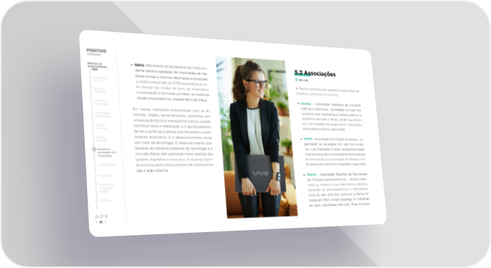 Relatório de — Bahia: diferimento do lançamento do ICMS inci- 5.2 Associações Sustentabilidade dente sobre a operação de importação de ma- 2021 GRI 2-28 térias-primas e insumos destinados à produção Mensagem e crédito presumido de ICMS equivalente ao va- A Positivo participa das seguintes associações de do CEO lor devido nas vendas de bens de informática indústria, comerciais ou técnicas: Sobre o e automação e terminais portáteis de telefonia Relatório celular produzidos na unidade fabril de Ilhéus. — Abinee - Associação Brasileira da indústria 1 Positivo Elétrica e Eletrônica - sociedade civil sem 昀椀ns Tecnologia Em nossas interações institucionais com os di- lucrativos que representa os setores elétrico e 2 Governança ferentes órgãos governamentais, primamos por eletrônico de todo o Brasil, sendo sua direto- Corporativa uma atuação técnica, transparente e ética, visando ria, com mandato de quatro anos, composta e 3 Capital contribuir para a elaboração e o aprimoramento eleita pelas próprias associadas. Humano de leis e políticas públicas que fomentem o cres- 4 Cadeia cimento econômico e o desenvolvimento social — APDM - Associação Polo Digital de Manaus - or- de Valor por meio da tecnologia. O desenvolvimento sus- ganização da sociedade civil, sem 昀椀ns lucrati- 5 Governo e tentável da indústria brasileira de tecnologia e a vos, cuja 昀椀nalidade é trazer representatividade sociedade civil inclusão digital vêm ganhando maior atenção dos e governança para o ecossistema de tecnologia organizada poderes legislativo e executivo. E estamos fazen- da informação e comunicação de Manaus a 昀椀m 6 Comunidades do a nossa parte nesse processo de conscientiza- de alavancá-lo de forma integrada e organizada. ção e ação coletiva. 7 Ambiental — Eletros - Associação Nacional de Fabricantes Sumário de de Produtos Eletroeletrônicos – reúne e repre- Conteúdo senta as maiores e mais importantes indústrias da GRI nacionais de eletrodomésticos e eletroeletrô- Créditos nicos do país. Sem 昀椀ns lucrativos, a Eletros foi criada em 1994, e hoje congrega 34 indústrias do setor, espalhadas pelo país. Atua na busca 41