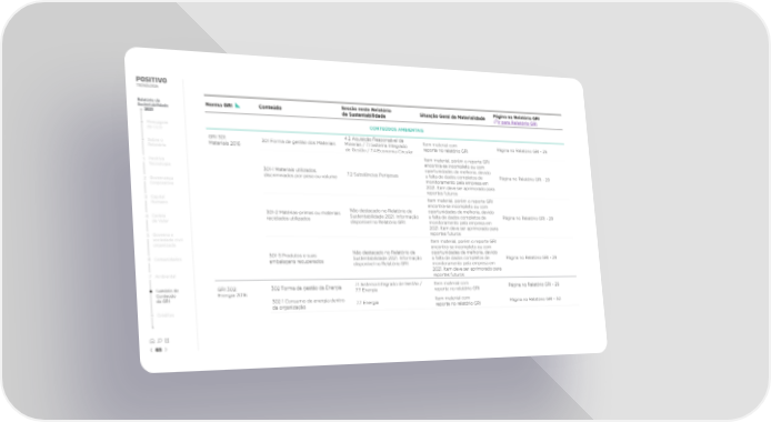 Relatório de Norma GRI Conteúdo Sessão neste Relatório Situação Geral de Materialidade Página no Relatório GRI Sustentabilidade de Sustentabilidade Ir para Relatório GRI 2021 Mensagem CONTEÚDOS AMBIENTAIS do CEO 4.2 Aquisição Responsável de GRI 301: 301 Forma de gestão dos Materiais Minerais / 7.1 Sistema Integrado Item material com Página no Relatório GRI - 29 Sobre o Materiais 2016 de Gestão / 7.4 Economia Circular reporte no relatório GRI Relatório Item material, porém o reporte GRI 1 Positivo encontra-se incompleto ou com Tecnologia 301-1 Materiais utilizados, oportunidades de melhoria, devido discriminados por peso ou volume 7.2 Substâncias Perigosas a falta de dados completos de Página no Relatório GRI - 29 2 Governança monitoramento pela empresa em Corporativa 2021. Item deve ser aprimorado para reportes futuros 3 Capital Item material, porém o reporte GRI Humano encontra-se incompleto ou com 301-2 Matérias-primas ou materiais Não destacado no Relatório de oportunidades de melhoria, devido 4 Cadeia reciclados utilizados Sustentabilidade 2021. Informação a falta de dados completos de Página no Relatório GRI - 29 de Valor disponível no Relatório GRI monitoramento pela empresa em 2021. Item deve ser aprimorado para 5 Governo e reportes futuros sociedade civil Item material, porém o reporte GRI organizada encontra-se incompleto ou com 301-3 Produtos e suas Não destacado no Relatório de oportunidades de melhoria, devido 6 Comunidades embalagens recuperados Sustentabilidade 2021. Informação a falta de dados completos de Página no Relatório GRI - 29 disponível no Relatório GRI monitoramento pela empresa em 2021. Item deve ser aprimorado para 7 Ambiental reportes futuros Sumário de GRI 302: 302 Forma de gestão da Energia 7.1 Sistema Integrado de Gestão / Item material com Página no Relatório GRI - 29 Conteúdo Energia 2016 7.7 Energia reporte no relatório GRI da GRI 302-1 Consumo de energia dentro Item material com da organização 7.7 Energia reporte no relatório GRI Página no Relatório GRI - 30 Créditos 65