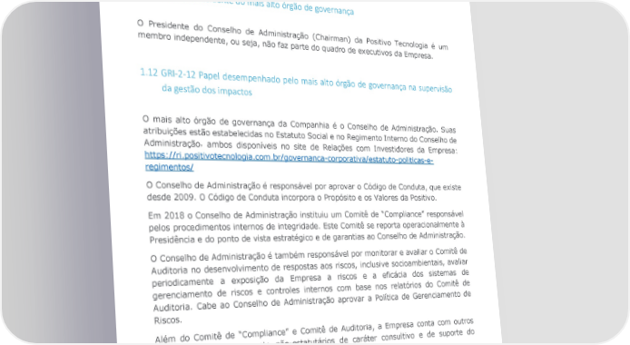 Os membros indicados ao Conselho de Administração da Empresa, incluindo os conselheiros independentes, deverão atender aos critérios listados na Política de Indicação de Membros da Administração, além dos requisitos legais e regulamentares e daqueles expressos no Estatuto Social da Companhia e demais pactos societários porventura existentes que tenham a Companhia como objeto. 1.11 GRI-2-11 Presidente do mais alto órgão de governança O Presidente do Conselho de Administração (Chairman) da Positivo Tecnologia é um membro independente, ou seja, não faz parte do quadro de executivos da Empresa. 1.12 GRI-2-12 Papel desempenhado pelo mais alto órgão de governança na supervisão da gestão dos impactos O mais alto órgão de governança da Companhia é o Conselho de Administração. Suas atribuições estão estabelecidas no Estatuto Social e no Regimento Interno do Conselho de Administração٫ ambos disponíveis no site de Relações com Investidores da Empresa: https://ri.positivotecnologia.com.br/governanca-corporativa/estatuto-politicas-e- regimentos/ O Conselho de Administração é responsável por aprovar o Código de Conduta, que existe desde 2009. O Código de Conduta incorpora o Propósito e os Valores da Positivo. Em 2018 o Conselho de Administração instituiu um Comitê de “Compliance” responsável pelos procedimentos internos de integridade. Este Comitê se reporta operacionalmente à Presidência e do ponto de vista estratégico e de garantias ao Conselho de Administração. O Conselho de Administração é também responsável por monitorar e avaliar o Comitê de Auditoria no desenvolvimento de respostas aos riscos, inclusive socioambientais, avaliar periodicamente a exposição da Empresa a riscos e a eficácia dos sistemas de gerenciamento de riscos e controles internos com base nos relatórios do Comitê de Auditoria. Cabe ao Conselho de Administração aprovar a Política de Gerenciamento de Riscos. Além do Comitê de “Compliance” e Comitê de Auditoria, a Empresa conta com outros comitês de Assessoramento não-estatutários de caráter consultivo e de suporte do Conselho de Administração sendo eles: § Comitê Financeiro § Comitê de Gente § Comitê de Comunicação § Comitê de Tecnologia Educacional § Comitê de Novos Negócios § Comitês adicionais não eleitos pelo Conselho de Administração: § Comitê de Partes Relacionadas Relatório Referenciado GRI | 2022 12