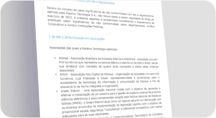 as legislações vigentes. Toda manifestação recebida é tratada com confidencialidade reforçando o comprometimento da Positivo Tecnologia S.A. com os manifestantes de boa- fé que são protegidos contrarretaliação. Este canal de comunicação pode ser acessado de forma anônima a qualquer momento pelo telefone 0800-724-8337, pelo e-mail: positivotec@helloethics.com ou através do link “Hello Ethics”. 1.27 GRI-2-27 Conformidade com leis e regulamentos Dentro do conceito de casos significativos de não conformidade com leis e regulamentos definido pela Positivo Tecnologia S.A.٫ não houve casos a serem reportados ao longo do exercício de 2022. A presente resposta é apresentada considerando o mapeamento de eventuais casos significativos de não conformidade pelos departamentos Jurídico Corporativo e Jurídico Instituições Públicas. 1.28 GRI-2-28 Par7cipação em associações Associações das quais a Positivo Tecnologia participa: § Abinee - Associação Brasileira da Indústria Elétrica e Eletrônica - sociedade civil sem fins lucrativos que representa os setores elétrico e eletrônico de todo o Brasil٫ sendo sua diretoria com mandato de quatro anos composta e eleita pelas próprias associadas. § APDM - Associação Polo Digital de Manaus - organização da sociedade civil sem fins lucrativos cuja finalidade é trazer representatividade e governança para o ecossistema de tecnologia da informação e comunicação de Manaus a fim de alavancá-lo de forma integrada e organizada. § Green Eletron - uma associação nacional criada com o objetivo de gerenciar e efetivar a implantação de um sistema para a gestão da logística reversa de produtos elétricos eletrônicos e seus componentes exigida pela Política Nacional de Resíduos Sólidos (PNRS). A Green Eletron atua como um agente setorial na interlocução com os diversos envolvidos na implementação da legislação vigente, com o objetivo de proporcionar escala, segurança, “compliance” e diferencial competitivo, com custos adequados para as suas associadas. § IPD Eletron - Instituto de Pesquisa e Desenvolvimento Tecnológico do Complexo Eletroeletrônico e Tecnologia da Informação - uma Entidade Tecnológica Setorial sem fins econômicos criada pela Abinee com o intuito de promover o desenvolvimento e a inovação tecnológica. O IPD Eletron tem como principal objetivo contribuir com as políticas públicas estruturadas para as áreas de ciência tecnologia e inovação; estimular e aprimorar a gestão da inovação nas empresas; ampliar os investimentos em P&D; além de apoiar na captação de recursos à inovação para compartilhamento do risco tecnológico. Relatório Referenciado GRI | 2022 21