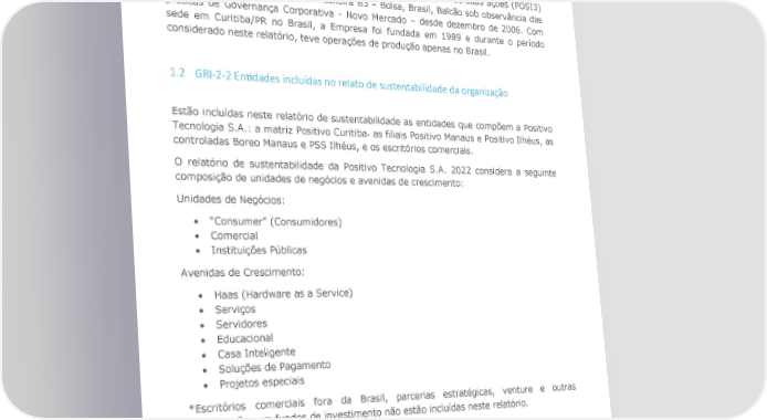 1 GRI-2-CONTEÚDO GERAL 1.1 GRI-2-1 Dados da Organização A Positivo Tecnologia S.A. é uma empresa de capital aberto, tendo suas ações (POSI3) negociadas na bolsa de valores brasileira B3 – Bolsa, Brasil, Balcão sob observância das práticas de Governança Corporativa - Novo Mercado – desde dezembro de 2006. Com sede em Curitiba/PR no Brasil, a Empresa foi fundada em 1989 e durante o período considerado neste relatório, teve operações de produção apenas no Brasil. 1.2 GRI-2-2 En7dades incluídas no relato de sustentabilidade da organização Estão incluídas neste relatório de sustentabilidade as entidades que compõem a Positivo Tecnologia S.A.: a matriz Positivo Curitiba٫ as filiais Positivo Manaus e Positivo Ilhéus, as controladas Boreo Manaus e PSS Ilhéus, e os escritórios comerciais. O relatório de sustentabilidade da Positivo Tecnologia S.A. 2022 considera a seguinte composição de unidades de negócios e avenidas de crescimento: Unidades de Negócios: • “Consumer” (Consumidores) • Comercial • Instituições Públicas Avenidas de Crescimento: • Haas (Hardware as a Service) • Serviços • Servidores • Educacional • Casa Inteligente • Soluções de Pagamento • Projetos especiais *Escritórios comerciais fora da Brasil, parcerias estratégicas, venture e outras participações em fundos de investimento não estão incluídas neste relatório. 1.3 GRI-2-3 Período de relato, frequência e ponto de contato Período coberto pelo relatório: 1º de janeiro a 31 de dezembro de 2022. Frequência anual. Dúvidas, comentários e outras informações sobre o presente relatório podem ser encaminhadas para o e-mail ri@positivo.com.br Data de publicação: 05.06.2023 Relatório Referenciado GRI | 2022 4
