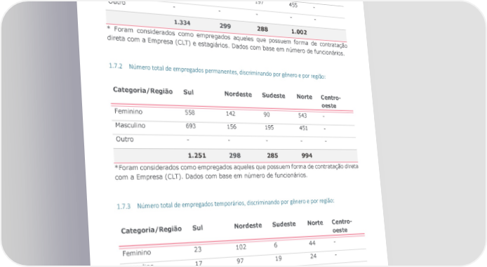 1.7.1 Número total de empregados, discriminando este total por gênero e por região: Categoria/Região Sul Nordeste Sudeste Norte Centro- oeste Feminino 594 142 91 547 - Masculino 740 157 197 455 - Outro - - - - - 1.334 299 288 1.002 * Foram considerados como empregados aqueles que possuem forma de contratação direta com a Empresa (CLT) e estagiários. Dados com base em número de funcionários. 1.7.2 Número total de empregados permanentes, discriminando por gênero e por região: Categoria/Região Sul Nordeste Sudeste Norte Centro- oeste Feminino 558 142 90 543 - Masculino 693 156 195 451 - Outro - - - - - 1.251 298 285 994 *Foram considerados como empregados aqueles que possuem forma de contratação direta com a Empresa (CLT). Dados com base em número de funcionários. 1.7.3 Número total de empregados temporários, discriminando por gênero e por região: Categoria/Região Sul Nordeste Sudeste Norte Centro- oeste Feminino 23 102 6 44 - Masculino 17 97 19 24 - Outro - - - - - 40 199 25 68 *Totalizando 332 empregados temporários. Relatório Referenciado GRI | 2022 7