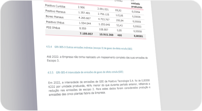 Tabela de emissões escopo 2: Emissões Energia Emissões de Unidade Produção consumida equivalentes Escopo 2 (unidades) (MWh) (tCO2) por unidade produzida Positivo Curitiba 2.906 2.091.021 89,92 0,03094 Positivo Manaus 1.357.481 2.756.125 115,85 0,00009 Boreo Manaus 4.265.667 4.703.767 200,84 0,00005 Positivo Ilhéus 1.554.044 1.255.640 53,43 0,00003 PSS Ilhéus 8.959 108.807 0,00 0,00000 7.189.057 10.915.360 460 0,00001 4.5.4 GRI-305-3 Outras emissões indiretas (escopo 3) de gases de efeito estufa (GEE) Até 2022٫ a Empresa não tinha realizado um mapeamento completo das suas emissões de Escopo 3. 4.5.5 GRI-305-4 Intensidade de emissões de gases de efeito estufa (GEE) Em 2022, a intensidade de emissões de GEE da Positivo Tecnologia S.A. foi de 0,00008 tCO2 por unidade produzida, 46% menor do que durante período anterior, refletindo a redução nas emissões de escopo 2. Para estes dados foram considerados produção e emissões das cinco plantas fabris da Empresa. Relatório Referenciado GRI | 2022 49