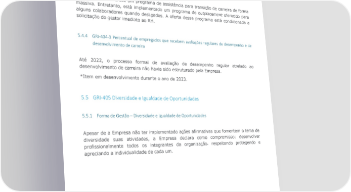 5.4.3 GRI-404-2 Programas para o aperfeiçoamento de competências dos empregados e de assistência para transição de carreira Em 2022, foram realizadas um total de 20.133 horas de treinamento para o aperfeiçoamento de competências dos empregados e demais trabalhadores da Positivo Tecnologia S.A. A Empresa não oferece um programa de assistência para transição de carreira de forma massiva. Entretanto, está implementado um programa de outplacement oferecido para alguns colaboradores quando desligados. A oferta desse programa está condicionada a solicitação do gestor imediato ao RH. 5.4.4 GRI-404-3 Percentual de empregados que recebem avaliações regulares de desempenho e de desenvolvimento de carreira Até 2022, o processo formal de avaliação de desempenho regular atrelado ao desenvolvimento de carreira não havia sido estruturado pela Empresa. *Item em desenvolvimento durante o ano de 2023. 5.5 GRI-405 Diversidade e Igualdade de Oportunidades 5.5.1 Forma de Gestão – Diversidade e Igualdade de Oportunidades Apesar de a Empresa não ter implementado ações afirmativas que fomentem o tema de diversidade suas atividades, a Empresa declara como compromisso: desenvolver profissionalmente todos os integrantes da organização٫ respeitando protegendo e apreciando a individualidade de cada um. Relatório Referenciado GRI | 2022 67