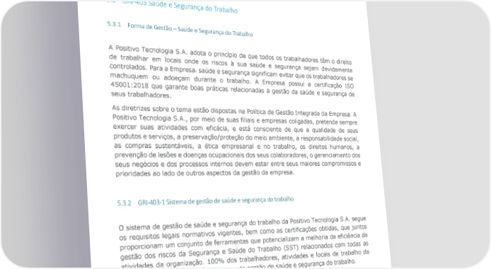 5.2.2 GRI-402-1 Prazo mínimo de aviso sobre mudanças operacionais O prazo mínimo de aviso sobre mudanças operacionais na Positivo Tecnologia S.A. é de 4 semanas. A Empresa atua conforme legislação e acordos sindicais sem definição de processos específicos. 5.3 GRI-403 Saúde e Segurança do Trabalho 5.3.1 Forma de Gestão – Saúde e Segurança do Trabalho A Positivo Tecnologia S.A. adota o princípio de que todos os trabalhadores têm o direito de trabalhar em locais onde os riscos à sua saúde e segurança sejam devidamente controlados. Para a Empresa٫ saúde e segurança significam evitar que os trabalhadores se machuquem ou adoeçam durante o trabalho. A Empresa possui a certificação ISO 45001:2018 que garante boas práticas relacionadas à gestão da saúde e segurança de seus trabalhadores. As diretrizes sobre o tema estão dispostas na Política de Gestão Integrada da Empresa. A Positivo Tecnologia S.A., por meio de suas filiais e empresas coligadas, pretende sempre exercer suas atividades com eficácia, e está consciente de que a qualidade de seus produtos e serviços, a preservação/proteção do meio ambiente, a responsabilidade social, as compras sustentáveis, a ética empresarial e no trabalho, os direitos humanos, a prevenção de lesões e doenças ocupacionais dos seus colaboradores, o gerenciamento dos seus negócios e dos processos internos devem estar entre seus maiores compromissos e prioridades ao lado de outros aspectos da gestão da empresa. 5.3.2 GRI-403-1 Sistema de gestão de saúde e segurança do trabalho O sistema de gestão de saúde e segurança do trabalho da Positivo Tecnologia S.A. segue os requisitos legais normativos vigentes, bem como as certificações obtidas, que juntos proporcionam um conjunto de ferramentas que potencializam a melhoria da eficiência da gestão dos riscos da Segurança e Saúde do Trabalho (SST) relacionados com todas as atividades da organização. 100% dos trabalhadores, atividades e locais de trabalho da Empresa são abrangidos pelo Sistema de gestão de saúde e segurança do trabalho. 5.3.3 GRI-403-2 Iden=ficação de periculosidade, avaliação de riscos e inves=gação de incidentes A Positivo Tecnologia S.A. possui um sistema de gestão (Interisk) das atividades rotineiras e não rotineiras onde estão mapeados os perigos e risco٫ bem como os controles necessários para eliminá-los ou minimizá-los. Através deste sistema de gestão, identifica- Relatório Referenciado GRI | 2022 61