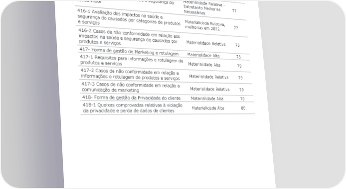 Materialidade 414-2 Impactos sociais negativos na cadeia de Significativa, melhorias 76 fornecedores e medidas em 2022, necessita maior Aprimoramento 415- Forma de gestão das Políticas públicas Materialidade Alta 76 415-1 Contribuições políticas Materialidade Alta 76 416- Forma de gestão da Saúde e segurança do Materialidade Relativa - consumidor Entretanto Melhorias 77 Necessárias 416-1 Avaliação dos impactos na saúde e Materialidade Relativa, segurança do causados por categorias de produtos melhorias em 2022 77 e serviços 416-2 Casos de não conformidade em relação aos impactos na saúde e segurança do causados por Materialidade Relativa 78 produtos e serviços 417- Forma de gestão de Marketing e rotulagem Materialidade Alta 78 417-1 Requisitos para informações e rotulagem de Materialidade Alta 79 produtos e serviços 417-2 Casos de não conformidade em relação a Materialidade Relativa 79 informações e rotulagem de produtos e serviços 417-3 Casos de não conformidade em relação a Materialidade Relativa 79 comunicação de marketing 418- Forma de gestão da Privacidade do cliente Materialidade Alta 79 418-1 Queixas comprovadas relativas à violação Materialidade Alta 80 da privacidade e perda de dados de clientes Relatório Referenciado GRI | 2022 88