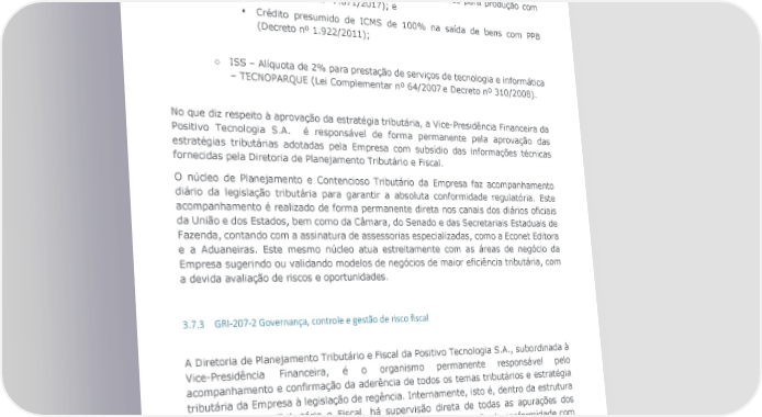 o CRÉDITO FINANCEIRO – Apropriação de crédito financeiro mediante multiplicador sobre o investimento em PD&I limitado a 10,92% até 31/12/2024, a 10,24% até 31/12/2026 e a 9,56% até 31/12/2029 (Lei nº 13.969/2019) para equipamentos de informática produzidos com PPB. o ICMS § Diferimento de ICMS na importação de insumos para produção com PPB. (Decreto nº 7.871/2017); e § Crédito presumido de ICMS de 100% na saída de bens com PPB (Decreto nº 1.922/2011); o ISS – Alíquota de 2% para prestação de serviços de tecnologia e informática – TECNOPARQUE (Lei Complementar nº 64/2007 e Decreto nº 310/2008). No que diz respeito à aprovação da estratégia tributária, a Vice-Presidência Financeira da Positivo Tecnologia S.A. é responsável de forma permanente pela aprovação das estratégias tributárias adotadas pela Empresa com subsídio das informações técnicas fornecidas pela Diretoria de Planejamento Tributário e Fiscal. O núcleo de Planejamento e Contencioso Tributário da Empresa faz acompanhamento diário da legislação tributária para garantir a absoluta conformidade regulatória. Este acompanhamento é realizado de forma permanente direta nos canais dos diários oficiais da União e dos Estados, bem como da Câmara, do Senado e das Secretariais Estaduais de Fazenda, contando com a assinatura de assessorias especializadas, como a Econet Editora e a Aduaneiras. Este mesmo núcleo atua estreitamente com as áreas de negócio da Empresa sugerindo ou validando modelos de negócios de maior eficiência tributária, com a devida avaliação de riscos e oportunidades. 3.7.3 GRI-207-2 Governança, controle e gestão de risco fiscal A Diretoria de Planejamento Tributário e Fiscal da Positivo Tecnologia S.A., subordinada à Vice-Presidência Financeira, é o organismo permanente responsável pelo acompanhamento e confirmação da aderência de todos os temas tributários e estratégia tributária da Empresa à legislação de regência. Internamente, isto é, dentro da estrutura de Planejamento Tributário e Fiscal, há supervisão direta de todas as apurações dos tributos devidos pela Empresa (créditos e débitos) para verificação da conformidade com a legislação tributária. Apurada eventual inconsistência pela Coordenação Fiscal, há reporte imediato à Diretoria e à área de Projetos para adequação sistêmica. A Diretoria de Planejamento Tributário e Fiscal possui três núcleos assim divididos: § Planejamento e Contencioso Tributário – que (i) controla todos os processos tributários ativos e passivos da Companhia; (ii) realiza acompanhamento da legislação tributária; (iii) analisa a viabilidade e elabora pedidos de regimes Relatório Referenciado GRI | 2022 39