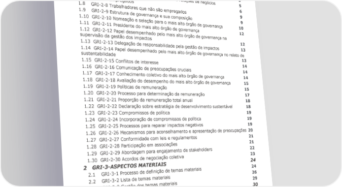 1 GRI-2-CONTEÚDO GERAL 4 1.1 GRI-2-1 Dados da Organização 4 1.2 GRI-2-2 Entidades incluídas no relato de sustentabilidade da organização 4 1.3 GRI-2-3 Período de relato, frequência e ponto de contato 4 1.4 GRI-2-4 Reformulações de informações 5 1.5 GRI-2-5 Verificação externa 5 1.6 GRI-2-6 Atividades, cadeia de valor e outras relações de negócios 5 1.7 GRI-2-7 Empregados 6 1.8 GRI-2-8 Trabalhadores que não são empregados 9 1.9 GRI-2-9 Estrutura de governança e sua composição 9 1.10 GRI-2-10 Nomeação e seleção para o mais alto órgão de governança 10 1.11 GRI-2-11 Presidente do mais alto órgão de governança 12 1.12 GRI-2-12 Papel desempenhado pelo mais alto órgão de governança na supervisão da gestão dos impactos 12 1.13 GRI-2-13 Delegação de responsabilidade pela gestão de impactos 13 1.14 GRI-2-14 Papel desempenhado pelo mais alto órgão de governança no relato de sustentabilidade 13 1.15 GRI-2-15 Conflitos de interesse 14 1.16 GRI-2-16 Comunicação de preocupações cruciais 14 1.17 GRI-2-17 Conhecimento coletivo do mais alto órgão de governança 14 1.18 GRI-2-18 Avaliação do desempenho do mais alto órgão de governança 15 1.19 GRI-2-19 Políticas de remuneração 15 1.20 GRI-2-20 Processo para determinação da remuneração 17 1.21 GRI-2-21 Proporção da remuneração total anual 18 1.22 GRI-2-22 Declaração sobre estratégia de desenvolvimento sustentável 18 1.23 GRI-2-23 Compromissos de política 19 1.24 GRI-2-24 Incorporação de compromissos de política 19 1.25 GRI-2-25 Processos para reparar impactos negativos 19 1.26 GRI-2-26 Mecanismos para aconselhamento e apresentação de preocupações 20 1.27 GRI-2-27 Conformidade com leis e regulamentos 21 1.28 GRI-2-28 Participação em associações 21 1.29 GRI-2-29 Abordagem para engajamento de stakeholders 22 1.30 GRI-2-30 Acordos de negociação coletiva 23 2 GRI-3-ASPECTOS MATERIAIS 24 2.1 GRI-3-1 Processo de definição de temas materiais 24 2.2 GRI-3-2 Lista de temas materiais 26 2.3 GRI-3-3 Gestão dos temas materiais 29 3 GRI-200-ASPECTOS ECONÔMICOS 30 3.1 GRI-201 Desempenho Econômico 30 3.2 GRI-202 Presença no Mercado 32 3.3 GRI-203 Impactos Econômicos Indiretos 33 3.4 GRI-204 Práticas de Compras 33 3.5 GRI-205 Combate à Corrupção 34 3.6 GRI-206 Concorrência Desleal 36 3.7 GRI-207 Tributos 36 Relatório Referenciado GRI | 2022 2