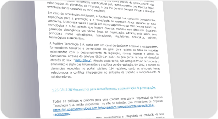 garantir que seus negócios sejam conduzidos de acordo com a Lei. A Política Corporativa de Prevenção à Corrupção é parte do Programa de “Compliance” da Positivo Tecnologia S.A. e tem por objetivo reforçar o compromisso da Empresa em cooperar proativamente na prevenção e combate à corrupção. As atividades da Positivo Tecnologia S.A. são desenvolvidas considerando a promoção da preservação e proteção do meio ambiente com foco na prevenção da poluição balizadas pelas diretrizes do Sistema de Gestão Integrado (SGI) através do gerenciamento dos aspectos e impactos ambientais significativos pelo monitoramento dos aspectos legais relacionados às atividades da Empresa, o que lhe permite prevenir mitigar e remediar eventuais danos causados ao meio ambiente. Em caso de ocorrências ambientais, a Positivo Tecnologia S.A. conta com procedimentos específicos para a prevenção e a remediação de eventuais danos causados ao meio ambiente. A Empresa realiza a gestão dos riscos corporativos por meio de uma plataforma tecnológica e automatizada que integra diversos módulos com diferentes disciplinas garantido abrangência em várias áreas da organização, administrando assim, seus principais riscos estratégicos, operacionais, regulatórios, financeiros, políticos, tecnológicos e ambientais. A Positivo Tecnologia S.A. conta com um canal de denúncias acessível a colaboradores٫ fornecedores terceiros e comunidade em geral para registro de fatos ou suspeitas relacionados com o descumprimento da legislação, normas internas e valores da Companhia, através do telefone 0800-724-8337, ou pelo portal na internet disponível através do link: “Hello Ethics”. Através deste portal, são assegurados ao denunciante o anonimato o sigilo das informações e a política de não retaliação. Em 2022, o número de denúncias recebidas no portal totalizou 114 registros, sendo os principais temas relacionados a conflitos interpessoais no ambiente de trabalho e comportamento de colaboradores. 1.26 GRI-2-26 Mecanismos para aconselhamento e apresentação de preocupações Todas as políticas e práticas para uma conduta empresarial responsável da Positivo Tecnologia S.A. estão disponíveis no site de Relações com Investidores da Empresa: https://ri.positivotecnologia.com.br/governanca-corporativa/estatuto-politicas-e- regimentos/ A Empresa, alinhada com a ética, transparência e integridade na condução de seus negócios, recomenda que todos os colaboradores ou aqueles que representam a Positivo Tecnologia S.A. devam observar e respeitar os valores, premissas e princípios descritos no Código de Conduta e demais políticas da Empresa. Seguindo os padrões éticos e de integridade, a Positivo Tecnologia S.A. disponibiliza o Hello Ethics como uma ferramenta segura e vinculada a uma empresa independente por meio da qual qualquer parte interessada pode relatar - de forma absolutamente sigilosa e confidencial - comportamentos ou situações que violem o Código de Conduta, a Política Anticorrupção e demais políticas e normas internas da Positivo Tecnologia S.A. ou mesmo Relatório Referenciado GRI | 2022 20