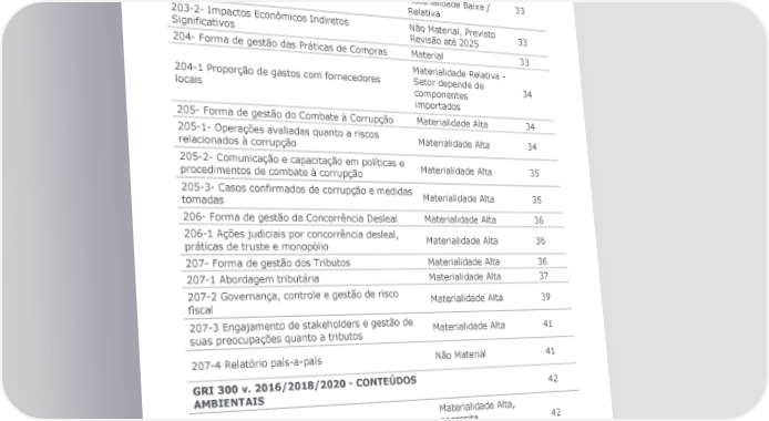 202-2- Proporção de membros da diretoria Materialidade Moderada 33 contratados na comunidade local 203 - Forma de gestão dos Impactos Econômicos Reportado, Porém Indiretos Materialidade Baixa / 33 Relativa 203-1- Investimentos em Infraestrutura e Serviços Reportado, Porém Suportados Materialidade Baixa / 33 Relativa 203-2- Impactos Econômicos Indiretos Não Material, Previsto 33 Significativos Revisão até 2025 204- Forma de gestão das Práticas de Compras Material 33 Materialidade Relativa - 204-1 Proporção de gastos com fornecedores Setor depende de 34 locais componentes importados 205- Forma de gestão do Combate à Corrupção Materialidade Alta 34 205-1- Operações avaliadas quanto a riscos Materialidade Alta 34 relacionados à corrupção 205-2- Comunicação e capacitação em políticas e Materialidade Alta 35 procedimentos de combate à corrupção 205-3- Casos confirmados de corrupção e medidas Materialidade Alta 35 tomadas 206- Forma de gestão da Concorrência Desleal Materialidade Alta 36 206-1 Ações judiciais por concorrência desleal, Materialidade Alta 36 práticas de truste e monopólio 207- Forma de gestão dos Tributos Materialidade Alta 36 207-1 Abordagem tributária Materialidade Alta 37 207-2 Governança, controle e gestão de risco Materialidade Alta 39 fiscal 207-3 Engajamento de stakeholders e gestão de Materialidade Alta 41 suas preocupações quanto a tributos 207-4 Relatório país-a-país Não Material 41 GRI 300 v. 2016/2018/2020 - CONTEÚDOS 42 AMBIENTAIS Materialidade Alta, 301- Forma de gestão dos Materiais necessita 42 aprimoramento 301-1- Materiais utilizados, discriminados por peso Materialidade 42 ou volume Significativa 301-2- Matérias-primas ou materiais reciclados Materialidade Alta, utilizados necessita 42 aprimoramento Relatório Referenciado GRI | 2022 83