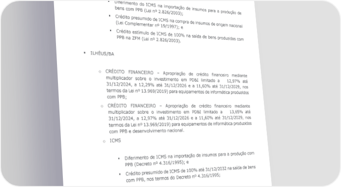 o Redução de 75% de IR sobre o lucro de exploração, nos termos dos respectivos Projetos SUDAM (arts. 1º, §§ 1º e 2º da Medida Provisória nº 2.199-14/ 2001, 3º do Decreto nº 4.212/2002 e 60 da IN SRF nº 267/ 2002). o ICMS § Diferimento do ICMS na importação de insumos para a produção de bens com PPB (Lei nº 2.826/2003); § Crédito presumido de ICMS na compra de insumos de origem nacional (Lei Complementar nº 19/1997); e § Crédito estímulo de ICMS de 100% na saída de bens produzidos com PPB na ZFM (Lei nº 2.826/2003). § ILHÉUS/BA o CRÉDITO FINANCEIRO – Apropriação de crédito financeiro mediante multiplicador sobre o investimento em PD&I limitado a 12,97% até 31/12/2024, a 12,29% até 31/12/2026 e a 11,60% até 31/12/2029, nos termos da Lei nº 13.969/2019) para equipamentos de informática produzidos com PPB; o CRÉDITO FINANCEIRO – Apropriação de crédito financeiro mediante multiplicador sobre o investimento em PD&I limitado a 13,65% até 31/12/2024, a 12,97% até 31/12/2026 e a 11,60% até 31/12/2029, nos termos da Lei nº 13.969/2019) para equipamentos de informática produzidos com PPB e desenvolvimento nacional. o ICMS § Diferimento de ICMS na importação de insumos para a produção com PPB (Decreto nº 4.316/1995); e § Crédito presumido de ICMS de 100% até 31/12/2032 na saída de bens com PPB, nos termos do Decreto nº 4.316/1995; o ISS - Alíquota de 2% para prestação de serviços de tecnologia e informática nos termos da Lei nº 4.097/2020 e Decreto nº 092/2021. § CURITIBA/PR Relatório Referenciado GRI | 2022 38