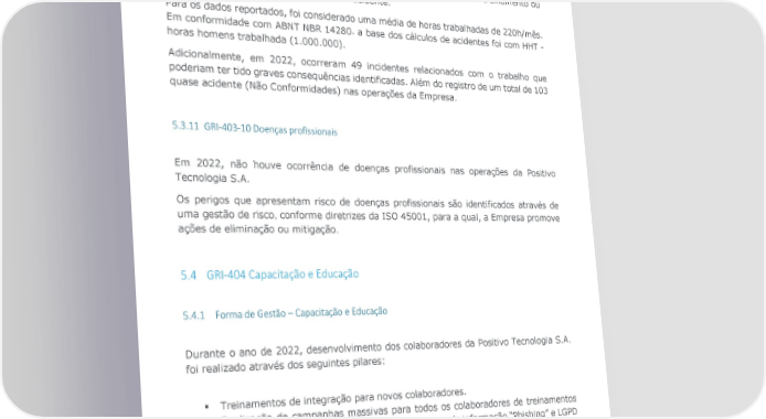 ISO 45001. Com base na gestão de perigos e riscos corporativos da Empresa٫ todos os perigos de nível grave são tratados com princípios de eliminação, porém quando não há possibilidade, são tratados subsequente com a redução, através de controles administrativos ou EPI ‘s. Para todos os acidentes ocorridos é realizado uma investigação para identificação da causa raiz do acidente e elaboração de um plano de ação, podendo este ser um treinamento ou uma correção do ambiente que causou o acidente. Para os dados reportados, foi considerado uma média de horas trabalhadas de 220h/mês. Em conformidade com ABNT NBR 14280٫ a base dos cálculos de acidentes foi com HHT - horas homens trabalhada (1.000.000). Adicionalmente, em 2022, ocorreram 49 incidentes relacionados com o trabalho que poderiam ter tido graves consequências identificadas. Além do registro de um total de 103 quase acidente (Não Conformidades) nas operações da Empresa. 5.3.11 GRI-403-10 Doenças profissionais Em 2022, não houve ocorrência de doenças profissionais nas operações da Positivo Tecnologia S.A. Os perigos que apresentam risco de doenças profissionais são identificados através de uma gestão de risco, conforme diretrizes da ISO 45001, para a qual, a Empresa promove ações de eliminação ou mitigação. 5.4 GRI-404 Capacitação e Educação 5.4.1 Forma de Gestão – Capacitação e Educação Durante o ano de 2022, desenvolvimento dos colaboradores da Positivo Tecnologia S.A. foi realizado através dos seguintes pilares: § Treinamentos de integração para novos colaboradores. § Realização de campanhas massivas para todos os colaboradores de treinamentos de Código de conduta٫ “Compliance” de Segurança da informação “Phishing” e LGPD § Disponibilização de cursos de temas diversos através do portal de desenvolvimento Saber Mais https://sabermais.positivotecnologia.com.br para o autodesenvolvimento (“self-learning”) de todos os colaboradores. § "Drops” de Agilidade - Campanha de treinamentos rápidos sobre metodologias ágeis realizados online (ao vivo) com objetivo de fomentar o tema na organização. Disponibilizado para a participação opcional dos colaboradores. Relatório Referenciado GRI | 2022 65