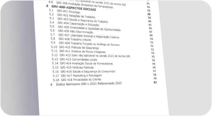 4 GRI-300-ASPECTOS AMBIENTAIS 42 4.1 GRI-301 Materiais 42 4.2 GRI-302 Energia 43 4.3 GRI-303 Água e efluentes 45 4.4 GRI-304 Biodiversidade 47 4.5 GRI-305 Emissões 47 4.6 GRI-306 Resíduos 51 4.7 GRI-307 Item não aplicável na versão 2021 da norma GRI 55 4.8 GRI-308 Avaliação Ambiental de Fornecedores 55 5 GRI-400-ASPECTOS SOCIAIS 56 5.1 GRI-401 Emprego 56 5.2 GRI-402 Relações de Trabalho 60 5.3 GRI-403 Saúde e Segurança do Trabalho 61 5.4 GRI-404 Capacitação e Educação 65 5.5 GRI-405 Diversidade e Igualdade de Oportunidades 67 5.6 GRI-406 Não Discriminação 69 5.7 GRI-407 Liberdade Sindical e Negociação Coletiva 70 5.8 GRI-408 Trabalho Infantil 71 5.9 GRI-409 Trabalho Forçado ou Análogo ao Escravo 71 5.10 GRI-410 Práticas de Segurança 72 5.11 GRI-411 Direitos de Povos Indígenas 73 5.12 GRI-412 Item não aplicável na versão 2021 da norma GRI 73 5.13 GRI-413 Comunidades Locais 73 5.14 GRI-414 Avaliação Social de Fornecedores 76 5.15 GRI-415 Políticas Públicas 76 5.16 GRI-416 Saúde e Segurança do Consumidor 77 5.17 GRI-417 Marketing e Rotulagem 78 5.18 GRI-418 Privacidade do Cliente 79 6 Índice Remissivo GRI v.2021 Referenciado 2022 81 Relatório Referenciado GRI | 2022 3