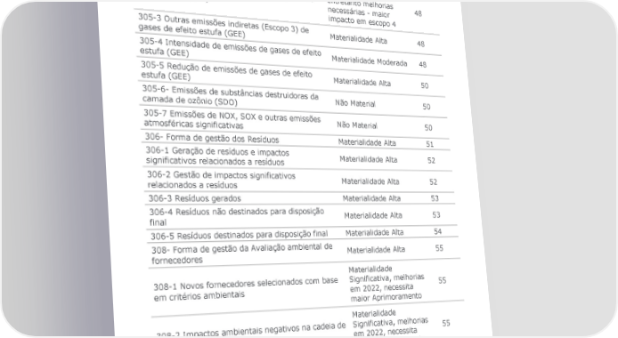 305- Forma de gestão das Emissões Materialidade Alta 47 Materialidade Relativa - 305-1 Emissões diretas (Escopo 1) de gases de entretanto melhorias 47 efeito estufa (GEE) necessárias - maior impacto em escopo 3 Materialidade Relativa - 305-2 Emissões indiretas (Escopo 2) de gases de entretanto melhorias 48 efeito estufa (GEE) necessárias - maior impacto em escopo 4 305-3 Outras emissões indiretas (Escopo 3) de Materialidade Alta 48 gases de efeito estufa (GEE) 305-4 Intensidade de emissões de gases de efeito Materialidade Moderada 48 estufa (GEE) 305-5 Redução de emissões de gases de efeito Materialidade Alta 50 estufa (GEE) 305-6- Emissões de substâncias destruidoras da Não Material 50 camada de ozônio (SDO) 305-7 Emissões de NOX, SOX e outras emissões Não Material 50 atmosféricas significativas 306- Forma de gestão dos Resíduos Materialidade Alta 51 306-1 Geração de resíduos e impactos Materialidade Alta 52 significativos relacionados a resíduos 306-2 Gestão de impactos significativos Materialidade Alta 52 relacionados a resíduos 306-3 Resíduos gerados Materialidade Alta 53 306-4 Resíduos não destinados para disposição Materialidade Alta 53 final 306-5 Resíduos destinados para disposição final Materialidade Alta 54 308- Forma de gestão da Avaliação ambiental de Materialidade Alta 55 fornecedores Materialidade 308-1 Novos fornecedores selecionados com base Significativa, melhorias 55 em critérios ambientais em 2022, necessita maior Aprimoramento Materialidade 308-2 Impactos ambientais negativos na cadeia de Significativa, melhorias 55 fornecedores e medidas em 2022, necessita maior Aprimoramento GRI 400 v.2016/2018 - CONTEÚDOS SOCIAIS 56 401- Forma de gestão dos Emprego Materialidade Alta 56 401-1 Novas contratações e rotatividade de Materialidade Alta 56 empregados Relatório Referenciado GRI | 2022 85
