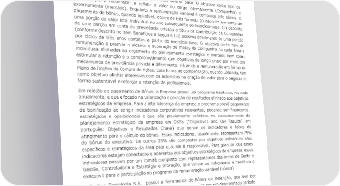 ainda receber uma remuneração variável que é baseada em metas específicas de desempenho e é ajustada anualmente para refletir as condições do mercado e as expectativas dos acionistas. Além disso eles podem receber opções de ações como forma de alinhar seus interesses com os interesses dos acionistas e incentivar o desempenho a longo prazo. A remuneração fixa é composta apenas pelo salário base. O objetivo deste tipo de remuneração é reconhecer e refletir o valor do cargo internamente (Companhia) e externamente (mercado). Enquanto a remuneração variável é composta pelo bônus. O pagamento de bônus, quando aplicável, ocorre de três formas: (i) depósito em conta de uma porção do valor total individual no ano subsequente ao exercício-base; (ii) depósito de uma porção em conta de previdência privada a título de contribuição da Companhia (conforme descrito no item Benefícios a seguir e (iii) possível diferimento de uma porção por ciclos de três anos contatos a partir do exercício-base. O objetivo deste tipo de remuneração é premiar o alcance e superação de metas da Companhia de cada área e individuais alinhadas ao orçamento do planejamento estratégico e mercado bem como estimular a retenção e o comprometimento com objetivos de longo prazo por meio dos mecanismos de previdência privada e diferimento. Há ainda a remuneração em forma de Plano de Opções de Compra de Ações. Esta forma de compensação, quando utilizada, tem como objetivo alinhar interesses com os acionistas na criação de valor para o negócio de forma sustentável e reforçar a retenção de profissionais. Em relação ao pagamento de Bônus, a Empresa possui um programa instituído, revisado anualmente, e que é focado na valorização e geração de resultados alinhado aos objetivos estratégicos da empresa. Para a alta liderança da empresa o programa prevê pagamento de bonificação ao atingir indicadores corporativos relevantes, podendo ser financeiros, estratégicos e operacionais e que são previamente definidos no desdobramento do planejamento estratégico da empresa em OKRs (“Objectives and Key Results”, em português: Objetivos e Resultados Chave) que geram os indicadores e faixas de atingimento para o cálculo do bônus. Esses indicadores, usualmente, representam 75% do bônus do executivo. Os outros 25% são compostos por objetivos individuais e/ou específicos e estratégicos da área pela qual ele é responsável. Para garantir que esses indicadores estejam conectados e aderentes aos objetivos estratégicos da empresa, esses indicadores passam por um comitê composto com representantes das áreas de Gente e Gestão, Controladoria e Estratégia e Inovação, que valiam os indicadores e habilitam o executivo para a participação no programa de remuneração variável (bônus) A Positivo Tecnologia S.A. possui a ferramenta do Bônus de Retenção, que tem por objetivo incentivar o colaborador a permanecer na empresa por um determinado período. Este incentivo tem parâmetros que variam conforme a necessidade de aplicação, mas em todos os casos está prevista a devolução pro-rata dos valores caso o contrato de trabalho seja rompido por parte do beneficiário do Bônus de Retenção. Um dos objetivos da Política de Remuneração da Positivo Tecnologia S.A. é proporcionar segurança financeira e estabilidade no futuro. Por este motivo, os membros do mais alto órgão de governança e os altos executivos têm a opção de participar do plano de previdência privada da Empresa٫ que oferece benefícios adicionais em relação à Relatório Referenciado GRI | 2022 16
