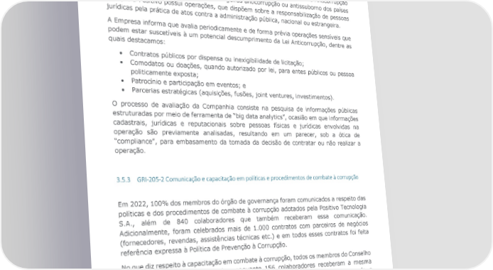 A Política Anticorrupção se aplica no Brasil e no exterior, tendo como objetivo assegurar que todos aqueles que atuem direta ou indiretamente em nome da Companhia, sejam eles empregados, consultores, representantes, contratantes, fornecedores, agentes, acionistas, controladores e administradores da Positivo, incluindo as sociedades diretamente controladas por esta, não violem os requisitos da Lei Brasileira Anticorrupção nº 12.846/2013 e das demais leis estrangeiras anticorrupção ou antissuborno dos países em que a Positivo possui operações, que dispõem sobre a responsabilização de pessoas jurídicas pela prática de atos contra a administração pública, nacional ou estrangeira. A Empresa informa que avalia periodicamente e de forma prévia operações sensíveis que podem estar suscetíveis à um potencial descumprimento da Lei Anticorrupção, dentre as quais destacamos: • Contratos públicos por dispensa ou inexigibilidade de licitação; • Comodatos ou doações, quando autorizado por lei, para entes públicos ou pessoa politicamente exposta; • Patrocínio e participação em eventos; e • Parcerias estratégicas (aquisições, fusões, joint ventures, investimentos). O processo de avaliação da Companhia consiste na pesquisa de informações públicas estruturadas por meio de ferramenta de “big data analytics”, ocasião em que informações cadastrais, jurídicas e reputacionais sobre pessoas físicas e jurídicas envolvidas na operação são previamente analisadas, resultando em um parecer, sob a ótica de “compliance”, para embasamento da tomada da decisão de contratar ou não realizar a operação. 3.5.3 GRI-205-2 Comunicação e capacitação em polí=cas e procedimentos de combate à corrupção Em 2022, 100% dos membros do órgão de governança foram comunicados a respeito das políticas e dos procedimentos de combate à corrupção adotados pela Positivo Tecnologia S.A., além de 840 colaboradores que também receberam essa comunicação. Adicionalmente, foram celebrados mais de 1.000 contratos com parceiros de negócios (fornecedores, revendas, assistências técnicas etc.) e em todos esses contratos foi feita referência expressa à Política de Prevenção à Corrupção. No que diz respeito à capacitação em combate à corrupção, todos os membros do Conselho de Administração foram treinados, enquanto 156 colaboradores receberam a mesma capacitação. Para o período coberto pelo presente relatório, não foi informado o desdobramento destes números por região e categoria funcional. 3.5.4 GRI-205-3 Casos confirmados de corrupção e medidas tomadas Não foram identificados casos confirmados de corrupção, durante o ano de 2022. Relatório Referenciado GRI | 2022 35