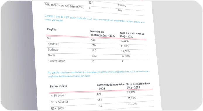 Durante o ano de 2022, foram realizadas 1.226 novas contratações de empregados, conforme detalhamento abaixo por gênero: Gênero Número de Taxa de contratações contratações - 2022 (%) - 2022 Homens 689 56,20% Mulheres 537 43,80% Não Binário ou Não Identificado 0 0% Durante o ano de 2022, foram realizadas 1.226 novas contratações de empregados, conforme detalhamento abaixo por região: Região Número de Taxa de contratações contratações - 2022 (%) - 2022 Sul 488 39,80% Nordeste 216 17,60% Sudeste 180 14,70% Norte 342 27,90% Centro-oeste 0 0 No que diz respeito à rota-vidade de empregados em 2022 a Empresa registrou entre 34,20% de rota-vidade – conforme detalhamento abaixo, por idade: Faixa etária Rotatividade numérica Taxa de rotatividade - 2022 (%) - 2022 < 30 anos 878 52,90% 30 > 50 anos 958 27,10% 50+ anos 102 21,90% Relatório Referenciado GRI | 2022 57