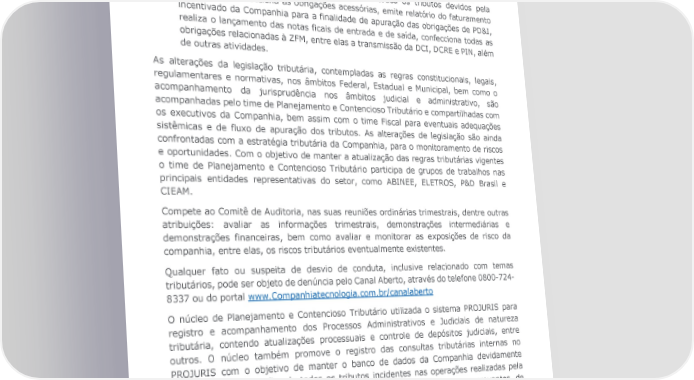 especiais; (iv) atende as consultas tributárias internas, incluindo as áreas de negócios, precificação e custeio, entre outras; § Fiscal Projetos – que atua junto à TI para correta parametrização do standard, customizações estabelecidas pela legislação e criação de robôs para automatização das operações fiscais, entre outras. Ademais, o time é responsável pela validação das informações fiscais, incluindo NCM do cadastro de materiais, entre outras; § Fiscal Operações – que realiza a apuração de todos os tributos devidos pela Companhia, confecciona as obrigações acessórias, emite relatório do faturamento incentivado da Companhia para a finalidade de apuração das obrigações de PD&I, realiza o lançamento das notas ficais de entrada e de saída, confecciona todas as obrigações relacionadas à ZFM, entre elas a transmissão da DCI, DCRE e PIN, além de outras atividades. As alterações da legislação tributária, contempladas as regras constitucionais, legais, regulamentares e normativas, nos âmbitos Federal, Estadual e Municipal, bem como o acompanhamento da jurisprudência nos âmbitos judicial e administrativo, são acompanhadas pelo time de Planejamento e Contencioso Tributário e compartilhadas com os executivos da Companhia, bem assim com o time Fiscal para eventuais adequações sistêmicas e de fluxo de apuração dos tributos. As alterações de legislação são ainda confrontadas com a estratégia tributária da Companhia, para o monitoramento de riscos e oportunidades. Com o objetivo de manter a atualização das regras tributárias vigentes o time de Planejamento e Contencioso Tributário participa de grupos de trabalhos nas principais entidades representativas do setor, como ABINEE, ELETROS, P&D Brasil e CIEAM. Compete ao Comitê de Auditoria, nas suas reuniões ordinárias trimestrais, dentre outras atribuições: avaliar as informações trimestrais, demonstrações intermediárias e demonstrações financeiras, bem como avaliar e monitorar as exposições de risco da companhia, entre elas, os riscos tributários eventualmente existentes. Qualquer fato ou suspeita de desvio de conduta, inclusive relacionado com temas tributários, pode ser objeto de denúncia pelo Canal Aberto, através do telefone 0800-724- 8337 ou do portal www.Companhiatecnologia.com.br/canalaberto O núcleo de Planejamento e Contencioso Tributário utilizada o sistema PROJURIS para registro e acompanhamento dos Processos Administrativos e Judiciais de natureza tributária, contendo atualizações processuais e controle de depósitos judiciais, entre outros. O núcleo também promove o registro das consultas tributárias internas no PROJURIS com o objetivo de manter o banco de dados da Companhia devidamente atualizado. As apurações de todos os tributos incidentes nas operações realizadas pela Companhia, assim como as respectivas obrigações acessórias e comprovantes de pagamento, são salvos em diretório específico no servidor da rede interna. Relatório Referenciado GRI | 2022 40