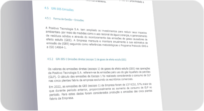 4.4 GRI-304 Biodiversidade Item não material para o relatório de 2022. Revisão desta condição está prevista em próxima análise de materialidade, quando stakeholder externos serão envolvidos mais diretamente e seguindo observação do Conselho de Administração, além de ponto de recomendação a materialidade técnica devido a presença da Empresa em proximidade a habitats importantes da região amazônica brasileira. 4.5 GRI-305 Emissões 4.5.1 Forma de Gestão – Emissões A Positivo Tecnologia S.A. tem ampliado os investimentos para reduzir seus impactos ambientais٫ por meio de medidas como o uso racional de água e energia, o gerenciamento de resíduos sólidos e através do monitoramento das emissões de gases causadores de efeito estufa (GEE). A Empresa mensura e monitora anualmente a sua estimativa de emissão de (GEE) seguindo como referências metodológicas o Programa Protocolo GHG e a ISO 14064-1. 4.5.2 GRI-305-1 Emissões diretas (escopo 1) de gases de efeito estufa (GEE) Os valores de emissões diretas (escopo 1) de gases de efeito estufa (GEE) nas operações da Positivo Tecnologia S.A. referem-se às emissões pelo uso do gás liquefeito de petróleo (GLP). O cálculo das emissões de Escopo 1 foi realizado considerando o consumo de GLP nas cinco plantas fabris da empresa excluindo os escritórios comerciais. Em 2022, as emissões de GEE (escopo 1) da Empresa foram de 137 tCO2, 57% maior do que durante período anterior, proporcionalmente ao aumento de consumo de GLP no período. Para estes dados foram considerados produção e emissões das cinco plantas fabris da Empresa. Relatório Referenciado GRI | 2022 47