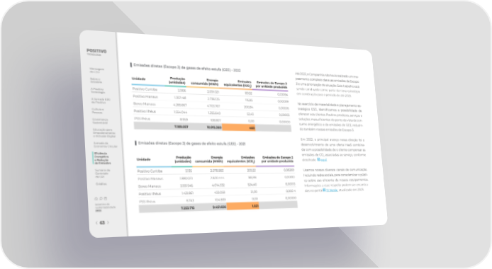 ▌ Emissões diretas (Escopo 2) de gases de efeito estufa (GEE) - 2022 Até 2022, a Companhia não havia realizado um ma- Mensagem peamento completo das suas emissões de Escopo do CEO Produção Energia Emissões Emissões de Escopo 2 3 e uma priorização de atuação. Este trabalho está Sobre o Unidade (unidades) consumida (MWh) equicalentes (tCO ) por unidade produzida sendo conduzido como parte da nova estratégia Relatório 2 Positivo Curitiba 2.906 2.091.021 89,92 0,03094 em construção para o período de até 2025. A Positivo Tecnologia Positivo Manaus 1.357.481 2.756.125 115,85 0,00009 A Jornada ESG No exercício de materialidade e planejamento es- da Positivo Boreo Manaus 4.265.667 4.703.767 200,84 0,00005 tratégico ESG, identi昀椀camos a possibilidade de Cultura e Positivo Ilhéus 1.554.044 1.255.640 53,43 0,00003 oferecer aos clientes Positivo, produtos, serviços e Pessoas soluções mais e昀椀cientes do ponto de vista de con- Governança PSS Ilhéus 8.959 108.807 0,00 0,00000 sumo energético e de emissões de GEE, reduzin- Sustentável 7.189.057 10.915.360 460 do também nossas emissões de Escopo 3. Educação para Empoderamento e Inclusão Digital Em 2022, o principal avanço nessa direção foi o Jornada da ▌ Emissões diretas (Escopo 2) de gases de efeito estufa (GEE) - 2021 desenvolvimento de uma oferta HaaS combina- Economia Circular da com a possibilidade de o cliente compensar as E昀椀ciência emissões de CO associadas ao serviço, conforme Energética Produção Energia Emissões Emissões de Escopo 2 2 e Redução Unidade (unidades) consumida (MWh) equicalentes (tCO ) por unidade produzida detalhado aqui. de Emissões 2 Sumário de Positivo Curitiba 3.135 2.078.983 259,22 0,08269 Usamos nossos diversos canais de comunicação, Conteúdo da GRI Positivo Manaus 1.880.031 2.820.444 185,99 0,00010 incluindo redes sociais, para conscientizar o públi- Créditos co sobre uso e昀椀ciente de nossos equipamentos. Boreo Manaus 3.931.945 4.014.332 524,40 0,00013 Informações a esse respeito podem ser encontra- Positivo Ilhéus 1.431.861 433.058 51,00 0,000 4 das no portal TI Verde, atualizado em 2023. Relatório de PSS Ilhéus 6.743 104.839 0,00 0,00000 Sustentabilidade 2022 7.253.715 9.451.656 1.021 63