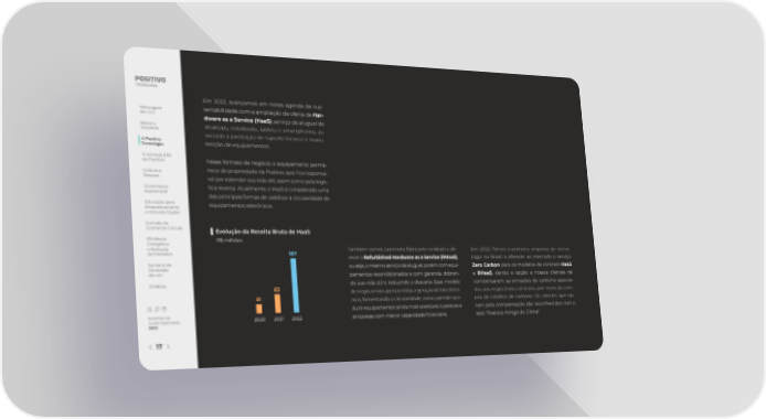Em 2022, avançamos em nossa agenda de sus- Mensagem tentabilidade com a ampliação da oferta de Har- do CEO dware as a Service (HaaS), serviço de aluguel de Sobre o desktops, notebooks, tablets e smartphones, as- Relatório sociado à prestação de suporte técnico e manu- A Positivo tenção de equipamentos. Tecnologia A Jornada ESG da Positivo Nesse formato de negócio, o equipamento perma- Cultura e nece de propriedade da Positivo, que 昀椀ca responsá- Pessoas vel por estender sua vida útil, assim como pela logís- Governança tica reversa. Atualmente, o HaaS é considerado uma Sustentável das principais formas de viabilizar a circularidade de Educação para equipamentos eletrônicos. Empoderamento e Inclusão Digital Jornada da Economia Circular ▌ Evolução da Receita Bruta de HaaS E昀椀ciência R$ milhões Energética e Redução Também somos a primeira fabricante no Brasil a ofe- Em 2022, fomos a primeira empresa de tecno- de Emissões 187 recer o Refurbished Hardware as a Service (RHaaS), logia no Brasil a oferecer ao mercado o serviço Sumário de ou seja, o mesmo serviço de aluguel, porém com equi- Zero Carbon para os modelos de contrato HaaS Conteúdo da GRI pamentos recondicionados e com garantia, dobran- e RHaaS, dando a opção a nossos clientes de Créditos do sua vida útil e reduzindo o descarte. Esse modelo compensarem as emissões de carbono associa- 63 de negócio não apenas reduz a geração de lixo eletrô- das aos respectivos contratos, por meio da com- 31 nico, fomentando a circularidade, como permite pro- pra de créditos de carbono. Os clientes que op- duzir equipamentos ainda mais acessíveis a pessoas e tam pela compensação são reconhecidos com o Relatório de 2020 2021 2022 esas com menor capacidade 昀椀nanceira. Sustentabilidade empr selo “Positivo Amigo do Clima”. 2022 17