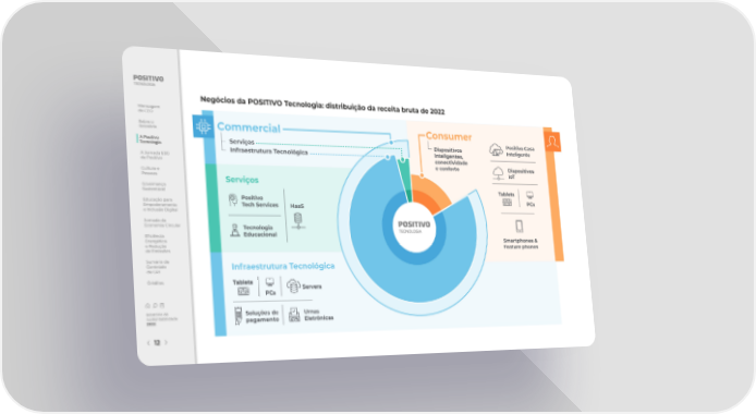 Negócios da POSITIVO Tecnologia: distribuição da receita bruta de 2022 Mensagem do CEO Sobre o Commercial Consumer Relatório A Positivo Serviços Dispositivos Positivo Casa Tecnologia Infraestrutura Tecnológica inteligentes, Inteligente A Jornada ESG conectividade da Positivo e conforto Dispositivos Cultura e IoT Pessoas Serviços Governança Tablets Sustentável Educação para Positivo PCs Empoderamento Tech Services HaaS e Inclusão Digital Jornada da Economia Circular Tecnologia E昀椀ciência Educacional Energética Smartphones & e Redução Feature phones de Emissões Sumário de Conteúdo Infraestrutura Tecnológica da GRI Créditos Tablets PCs Servers Relatório de Soluções de Urnas Sustentabilidade pagamento Eletrônicas 2022 12