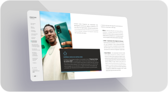Embora nosso Programa de Integridade seja A Positivo participa das seguintes associações de Mensagem abrangente e tenha por objetivo fomentar a cul- indústria, comerciais ou técnicas: do CEO tura ética da organização, reforçamos particular- Sobre o mente duas áreas que entendemos materiais para ― Abinee - Associação Brasileira da Indústria Elétrica Relatório nossa realidade: combate à corrupção e privacida- e Eletrônica - sociedade civil sem 昀椀ns lucrativos que A Positivo de e proteção de dados. representa os setores elétrico e eletrônico de todo o Tecnologia A Jornada ESG Brasil, sendo sua diretoria com mandato de quatro da Positivo anos composta e eleita pelas próprias associadas. Cultura e Pessoas ― APDM - Associação Polo Digital de Manaus - Governança organização da sociedade civil sem 昀椀ns lucrati- Sustentável vos cuja 昀椀nalidade é trazer representatividade Educação para e governança para o ecossistema de tecnologia Empoderamento e Inclusão Digital da informação e comunicação de Manaus a 昀椀m Jornada da de alavancá-lo de forma integrada e organizada. Economia Circular E昀椀ciência ― Green Eletron - uma associação nacional criada Energética e Redução com o objetivo de gerenciar e efetivar a implanta- de Emissões ção de um sistema para a gestão da logística rever- EMPRESA AMIGA DA JUSTIÇA 2022 Sumário de sa de produtos elétricos eletrônicos e seus compo- Conteúdo A Positivo Tecnologia recebeu a renovação do selo “Empresa Amiga da GRI da Justiça 2022”, concedido pelo Tribunal de Justiça do Estado de nentes exigida pela Política Nacional de Resíduos Créditos São Paulo (TJSP). A certi昀椀cação é feita para companhias que, durante Sólidos (PNRS). A Green Eletron atua como um o ano, se comprometeram com políticas que buscam a melhoria da agente setorial na interlocução com os diversos en- comunicação com os clientes e o desenvolvimento de projetos de volvidos na implementação da legislação vigente utilização de métodos autocompositivos, evitando a judicialização. com o objetivo de proporcionar escala, segurança, Relatório de compliance e diferencial competitivo com custos Sustentabilidade 2022 adequados para as suas associadas. 49
