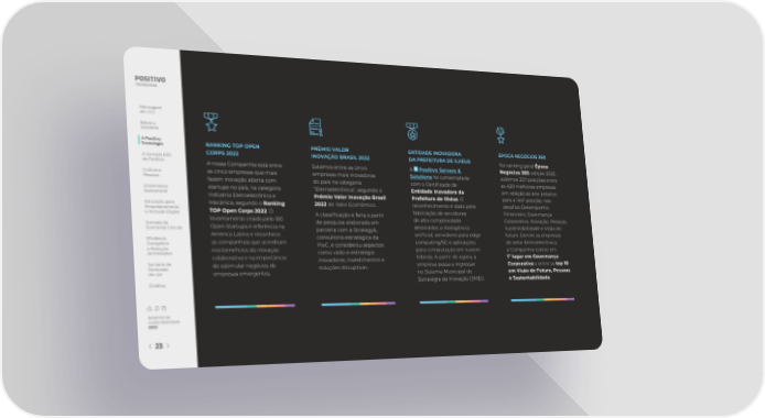 Mensagem do CEO Sobre o Relatório A Positivo RANKING TOP OPEN PRÊMIO VALOR ENTIDADE INOVADORA ÉPOCA NEGÓCIOS 360 Tecnologia A Jornada ESG CORPS 2022 INOVAÇÃO BRASIL 2022 DA PREFEITURA DE ILHÉUS No ranking geral Época da Positivo A nossa Companhia está entre Estamos entre as cinco A Positivo Servers & Negócios 360, edição 2022, Cultura e as cinco empresas que mais empresas mais inovadoras Solutions foi contemplada subimos 207 posições entre Pessoas fazem inovação aberta com do país na categoria com o Certi昀椀cado de as 420 melhores empresas Governança startups no país, na categoria “Eletroeletrônica”, segundo o Entidade Inovadora da em relação ao ano anterior, Sustentável Indústria Eletroeletrônica e Prêmio Valor Inovação Brasil Prefeitura de Ilhéus. O para a 144ª posição, nos Educação para Mecânica, segundo o Ranking 2022 do Valor Econômico. reconhecimento é dado pela desa昀椀os Desempenho Empoderamento TOP Open Corps 2022. O fabricação de servidores Financeiro, Governança e Inclusão Digital A classi昀椀cação é feita a partir levantamento criado pelo 100 de pesquisa elaborada em de alta complexidade Corporativa, Inovação, Pessoas, Jornada da Open Startups é referência na destinados a inteligência Sustentabilidade e Visão de Economia Circular parceria com a Strategy&, América Latina e reconhece consultoria estratégica da arti昀椀cial, servidores para edge futuro. Dentre as empresas E昀椀ciência as companhias que acreditam computing/5G e aplicações do setor Eletroeletrônica, Energética PwC, e considerou aspectos e Redução nos benefícios da inovação como visão e estratégia para computação em nuvem a Companhia esteve em de Emissões colaborativa e na importância híbrida. A partir de agora, a 1º lugar em Governança Sumário de de estimular negócios de inovadoras, investimentos e empresa passa a ingressar Corporativa e entre os top 10 Conteúdo soluções disruptivas. da GRI empresas emergentes. no Sistema Municipal de em Visão de Futuro, Pessoas Créditos Estratégia da Inovação (SMEI). e Sustentabilidade. Relatório de Sustentabilidade 2022 23