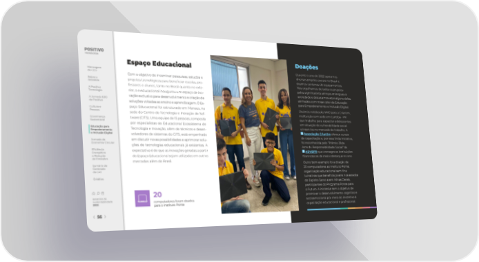 Espaço Educacional Doações Mensagem Durante o ano de 2022 apoiamos do CEO Com o objetivo de incentivar pesquisas, estudos e diversos projetos sociais no Brasil e Sobre o doamos centenas de equipamentos. Relatório projetos tecnológicos para bene昀椀ciar escolas, pro- Nos orgulhamos de todos os projetos fessores e alunos, tanto no Brasil quanto no exte- pelos signi昀椀cativos serviços entregues à A Positivo rior, o e.educacional inaugurou um espaço de ino- sociedade e destacamos aqui alguns deles, Tecnologia A Jornada ESG vação exclusivo para desenvolvimento e criação de alinhados com nosso pilar de Educação da Positivo soluções voltadas ao ensino e aprendizagem. O Es- para Empoderamento e Inclusão Digital. Cultura e paço Educacional foi estruturado em Manaus, na Doamos notebooks VAIO para a CriarUm, Pessoas sede do Centro de Tecnologia e Inovação de Sof- instituição com sede em Curitiba - PR Governança tware (CITS). Uma equipe de 15 pessoas, composta que trabalha para capacitar adolescentes Sustentável por especialistas do Educacional Ecossistema de em situação de vulnerabilidade social Educação para Tecnologia e Inovação, além de técnicos e desen- e inseri-los no mercado de trabalho. A Empoderamento Associação CriarUm oferece cursos e Inclusão Digital volvedores de sistemas do CITS, está empenhada em discutir novas possibilidades e aprimorar solu- de capacitação e, por essa linda iniciativa, Jornada da foi reconhecida pelo “Prêmio Zilda Economia Circular ções de tecnologias educacionais já existentes. A Arns de Responsabilidade Social” da E昀椀ciência expectativa é de que as inovações geradas a partir ADVBPR que consagra as instituições Energética e Redução do Espaço Educacional sejam utilizadas em outros 昀椀lantrópicas de maior destaque no ano. de Emissões mercados além do Brasil. Sumário de Outro bom exemplo foi a doação de Conteúdo 20 computadores ao Instituto Ponte, da GRI organização educacional sem 昀椀ns Créditos lucrativos que bene昀椀cia jovens nos estados do Espírito Santo e em Minas Gerais, participantes do Programa Ponte para 20 o Futuro. A iniciativa tem o objetivo de Relatório de promover o desenvolvimento cognitivo e Sustentabilidade computadores foram doados socioemocional por meio do incentivo à 2022 para o Instituto Ponte capacitação educacional e pro昀椀ssional. 56